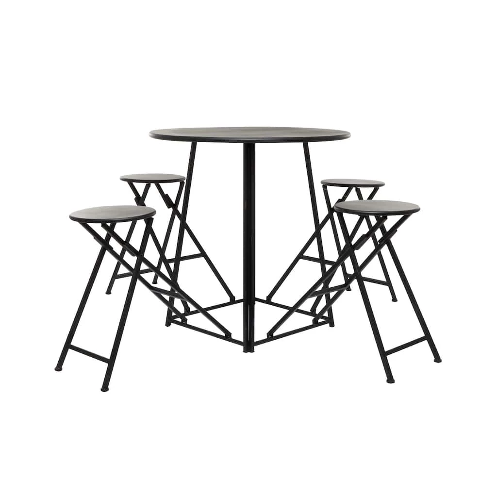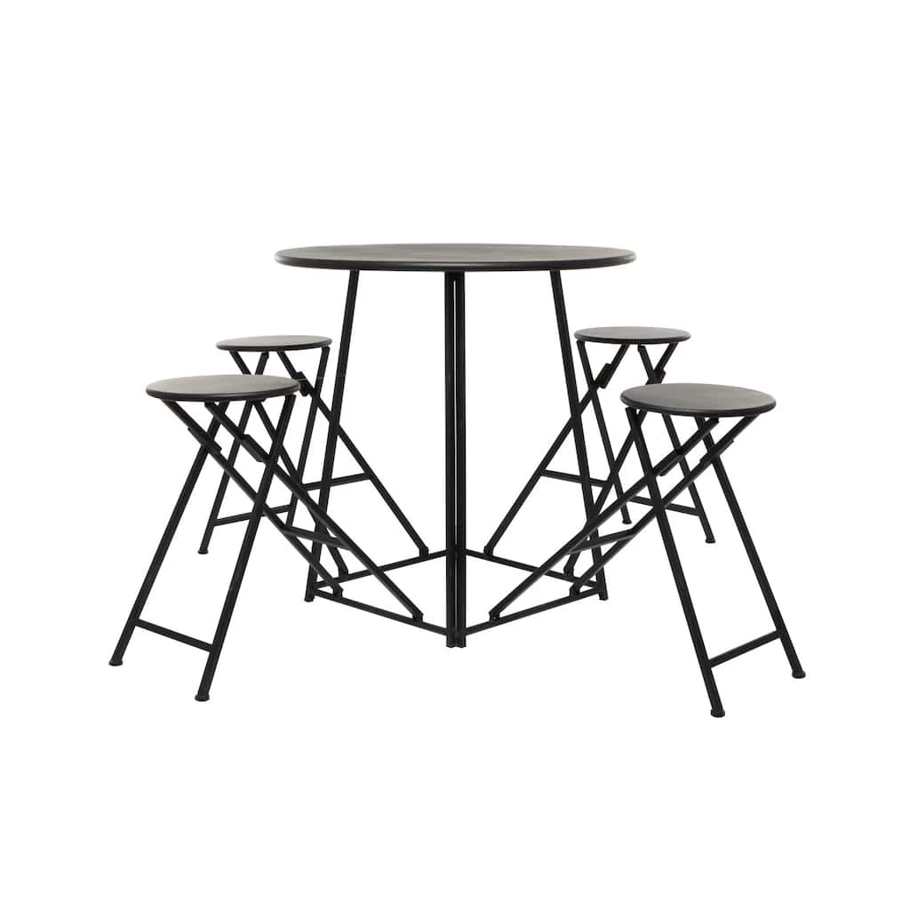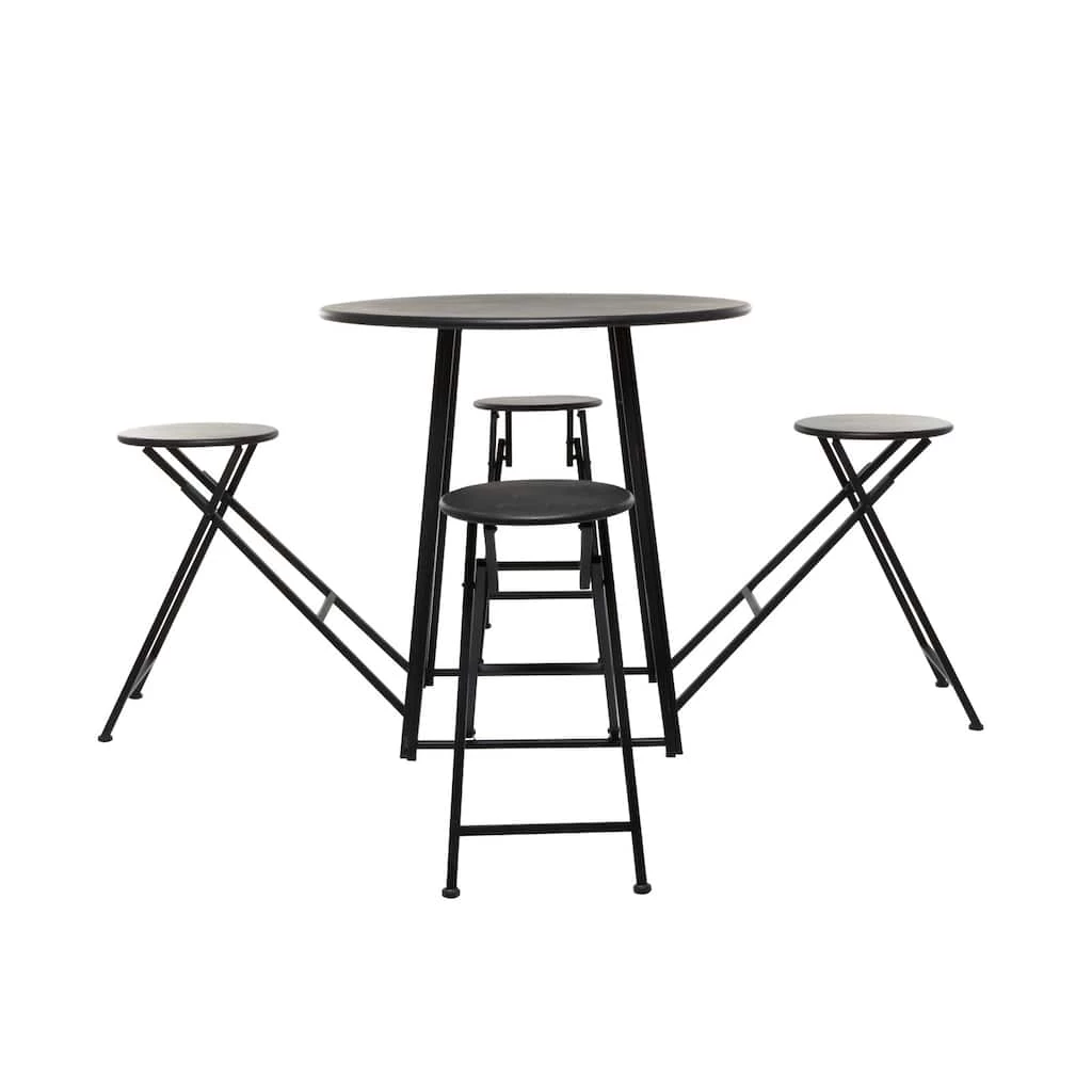 Enhance the charm of your dining area with this folding dining table set that features a round table with four foldable chairs. Made of iron, this dining table set emphasizes a delightful minimalist or contemporary look that will enhance the homey atmosphere of your interior space. This 4-seater dining table set offers the functions of refined dining experience with its simple and compact design, making it perfect for smaller spaces and allows you to host small dinner and cocktail parties with ease. Designed with protective leg base at the bottom that prevent scratching furniture and table tops, as well as sliding around.