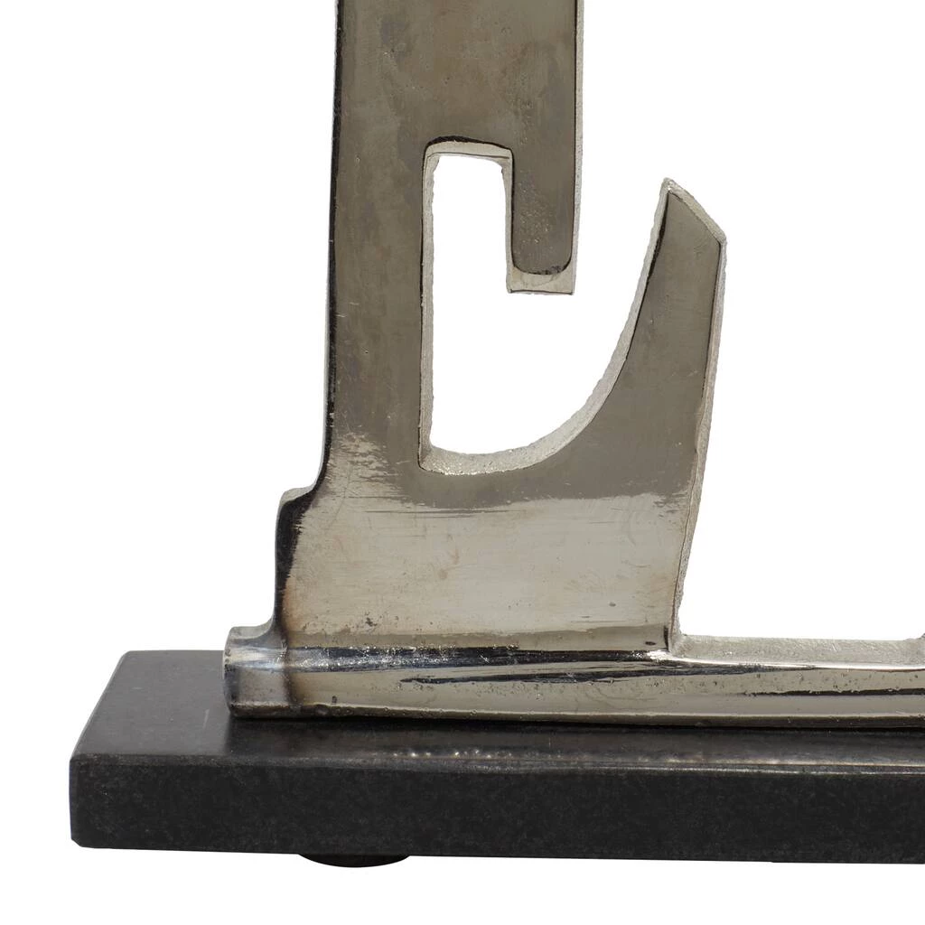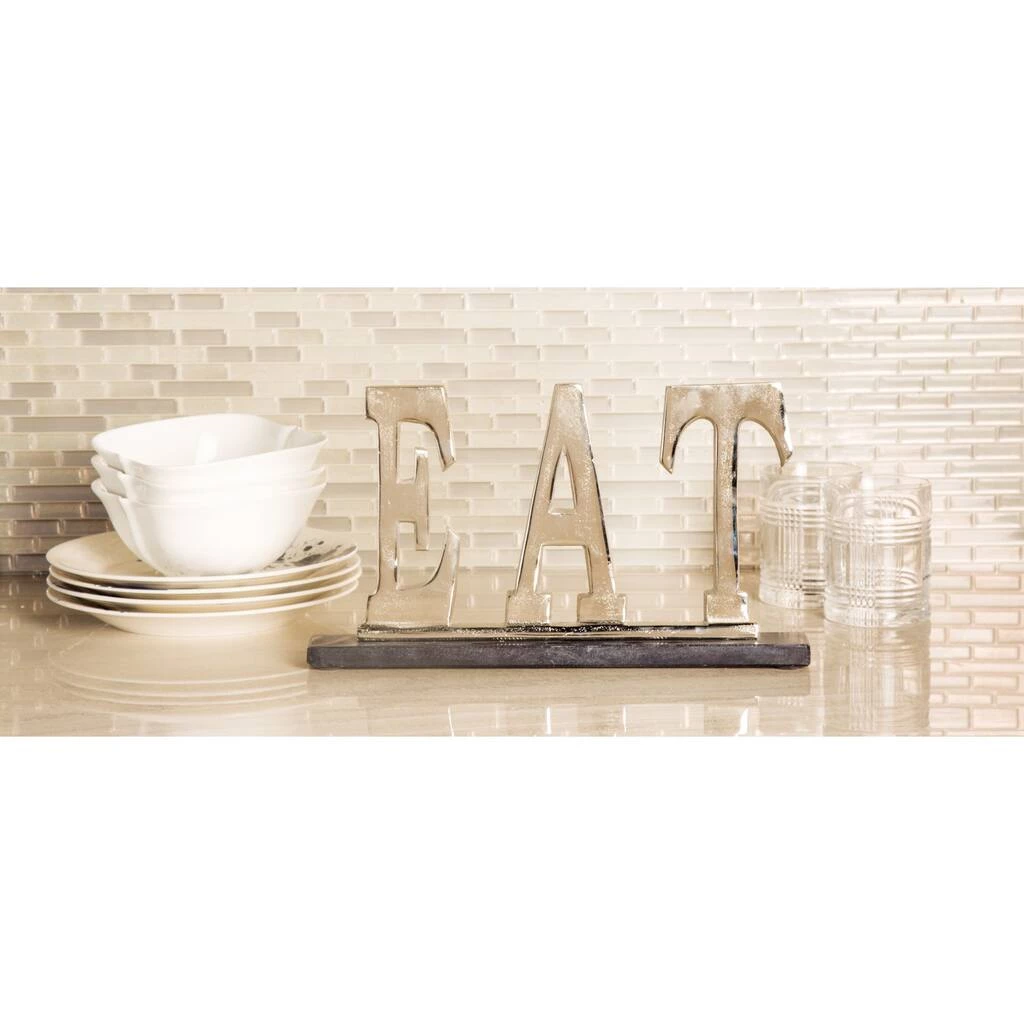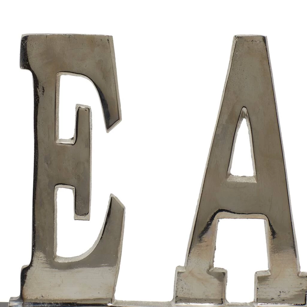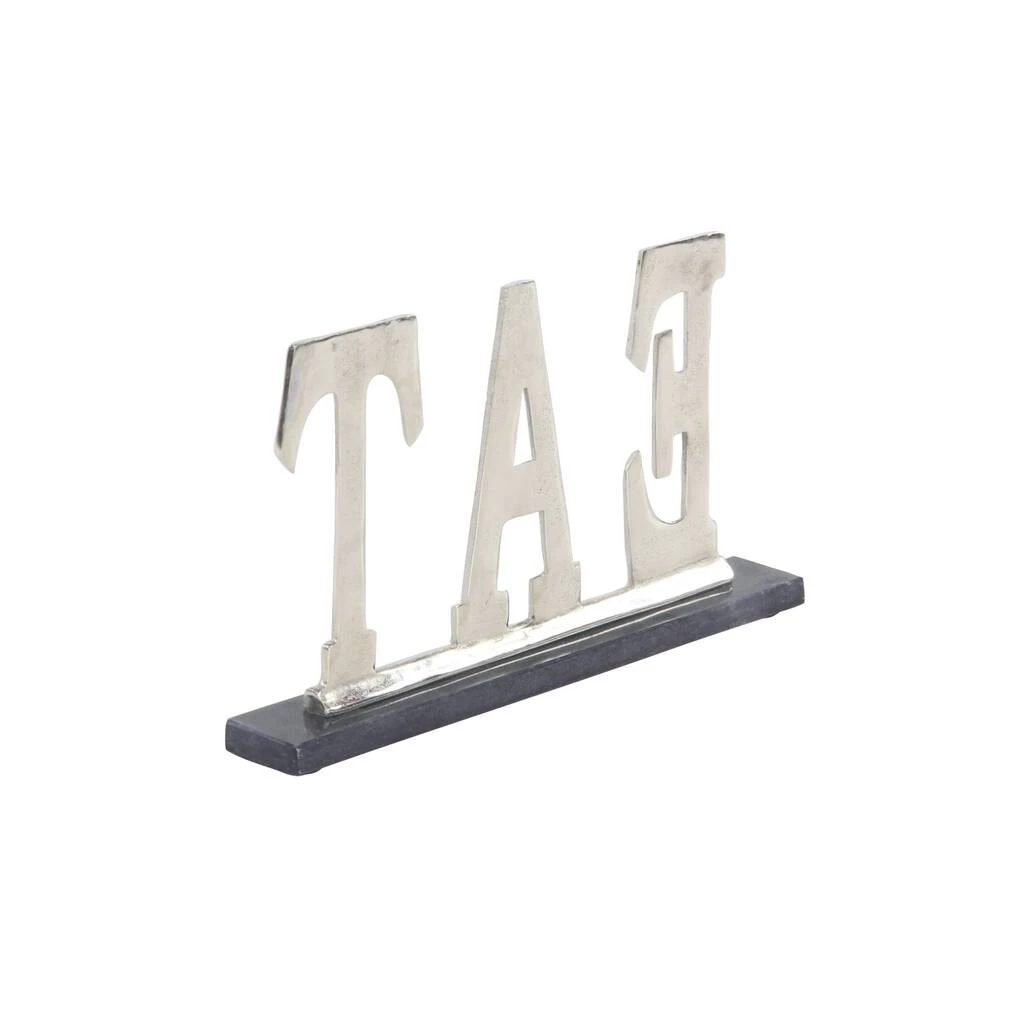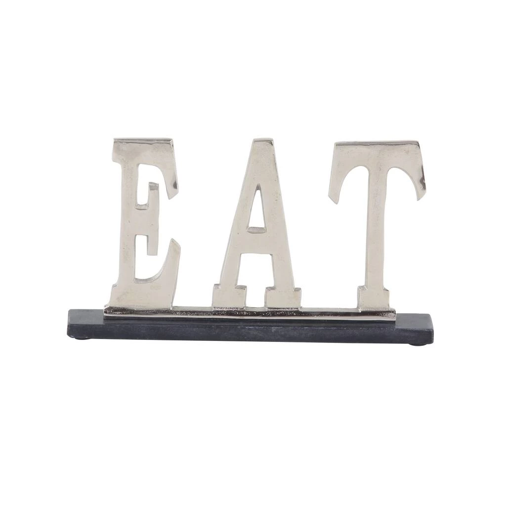 Who’s hungry, folks? Add a speck of youthful fun into your modern and glam living home styles with this shiny and stylish, small-sized silver metallic EAT standing sign decor. This ‘mouthful’ decoration features small-sized aluminum letter cut-outs of the word EAT in a polished, silver metal finish and a smooth black base made of marble. Ideal as decorative additions for shelves, tables, desks, kitchen, cafes, and restaurants.