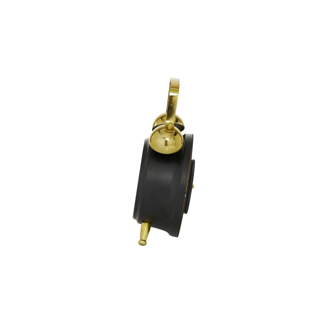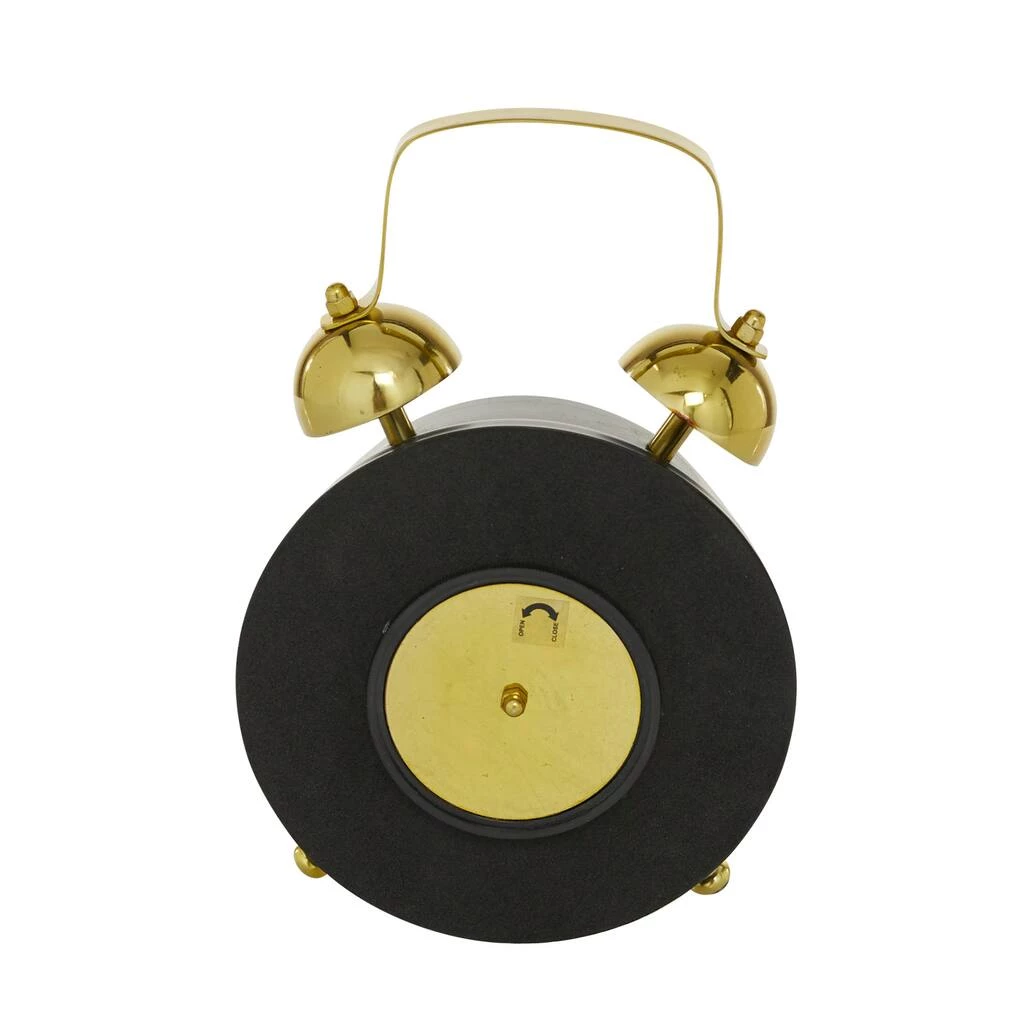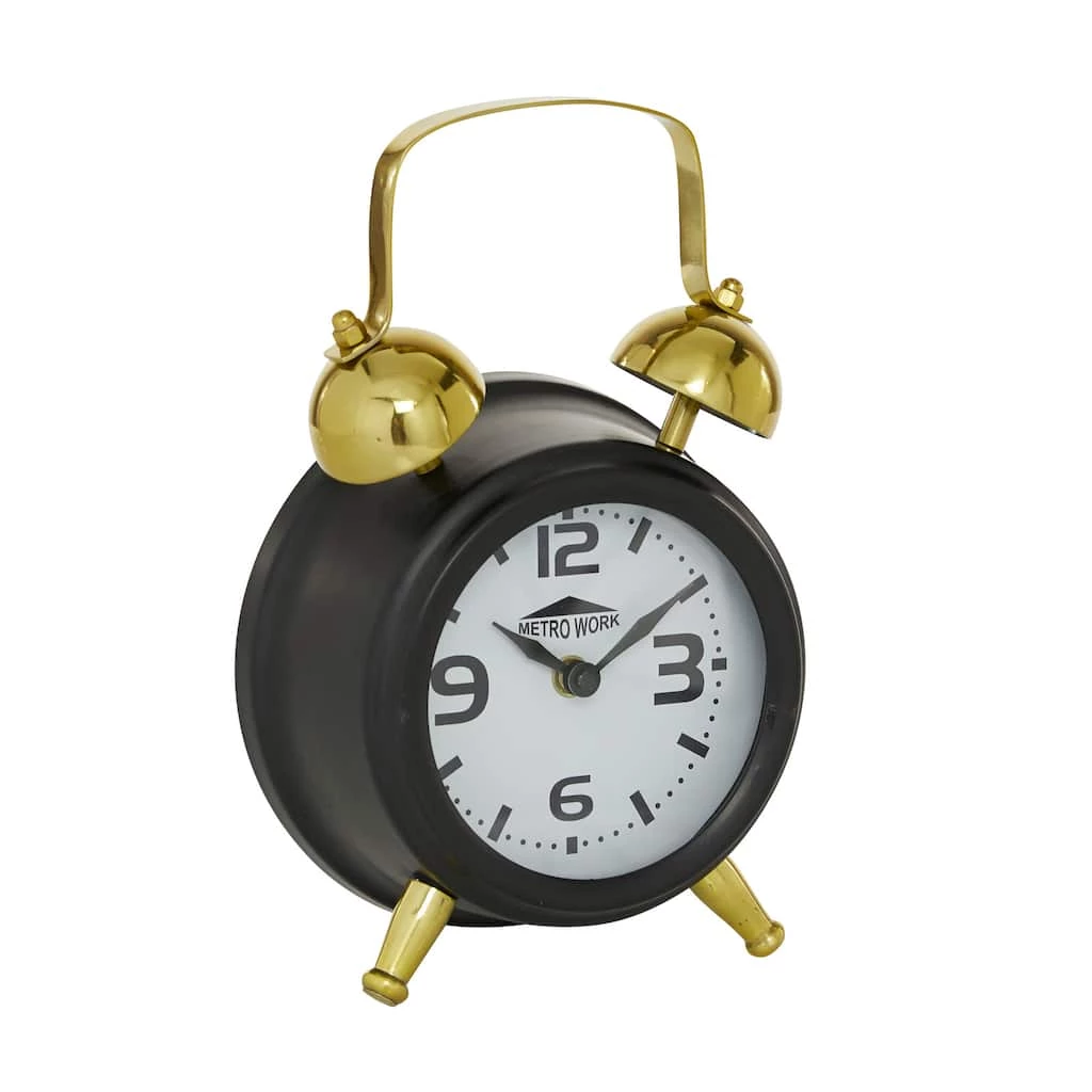 This round 9″ Black & Gold Stainless Steel Traditional Clock with gold metal bells gives your contemporary home a chic timeless vibe. This round table clock features two tone color contrast trend with matte black and gold glossy finish. Displayed on the coffee or console tables of your dining or living room, entryways or hallways, this decorative table clock is an elegant addition to your contemporary-themed home. Arabic numbers and hash marks on a white clock face. Displays cardinal numbers and a “Metro Work” typography on the clock face.