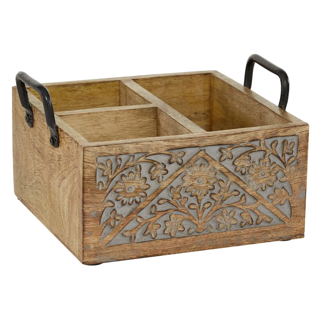 This compact kitchen caddy brings earthy wood with delicate designs to your space. Store wine bottles, condiment bottles, napkins, or any other kitchen wares in this wooden caddy that has two smaller bottle-sized cubbies and one larger rectangular cubby, perfect for large napkins. Sturdy iron handles ensure secure carrying. The carved floral designs bring accent decor style to this home organizer you can use in any room of the house. Designed with black rubber stoppers at the base that prevent scratching furniture and table tops, as well as sliding around.