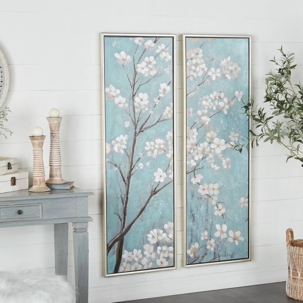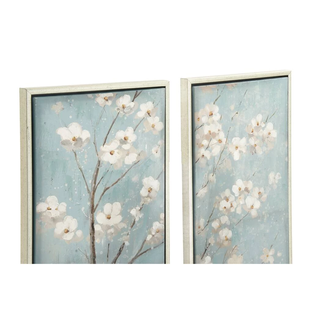 Dreamily botanical, this set of 2 symmetrical white magnolia tree paintings feature soft white petaled flowers blooming from long, brown branches. Side by side, the pair of acrylic paintings create a cohesive depiction of one large tree. The first rectangular painting illustrates the 2 tree branches with flowers, and the second shows the edges of the branches with several white flowers. Both botanical paintings have muted aqua backgrounds with faint, textural paint dabs to create a dimensional atmosphere and are housed in ready-to-hang metallic silver-painted fir wood frames.