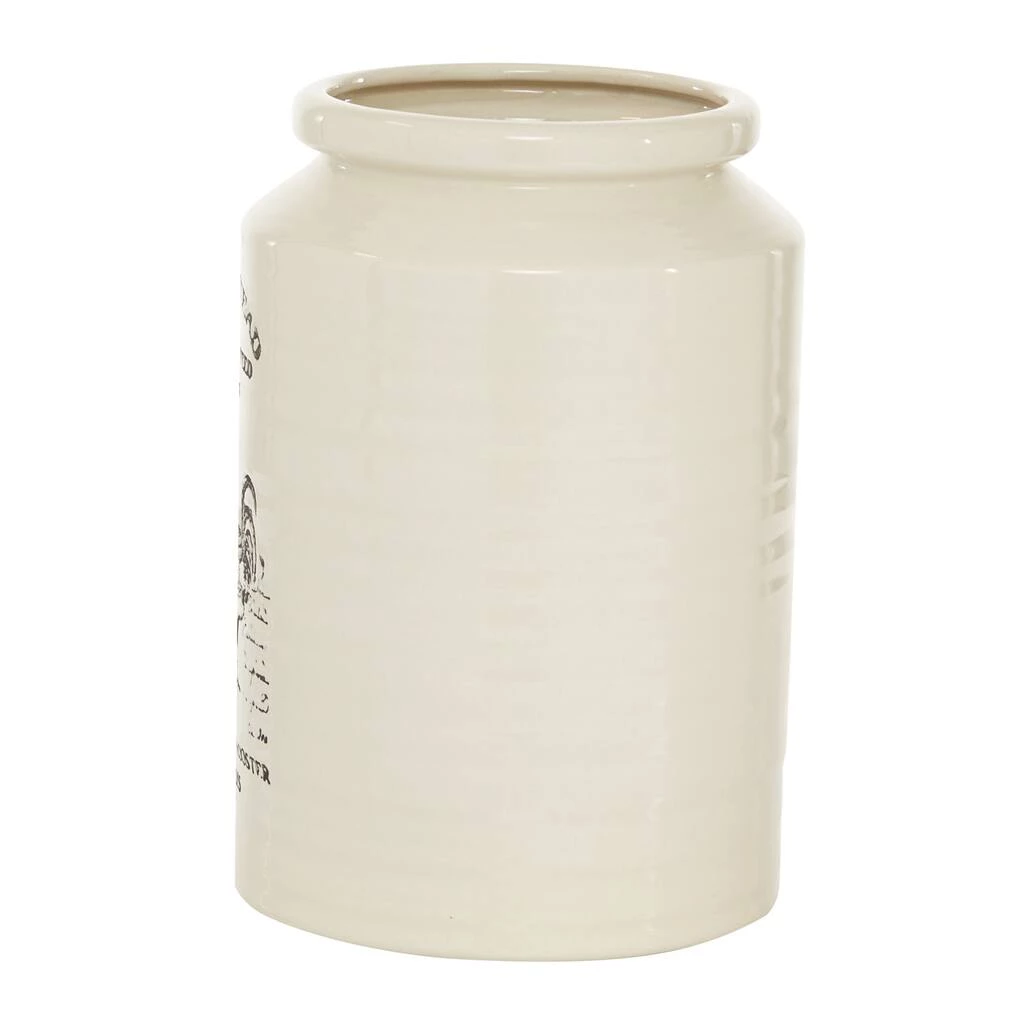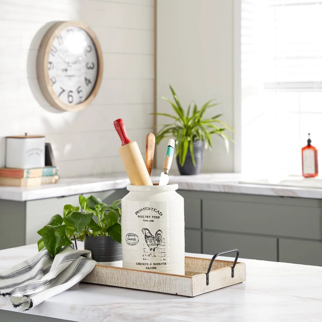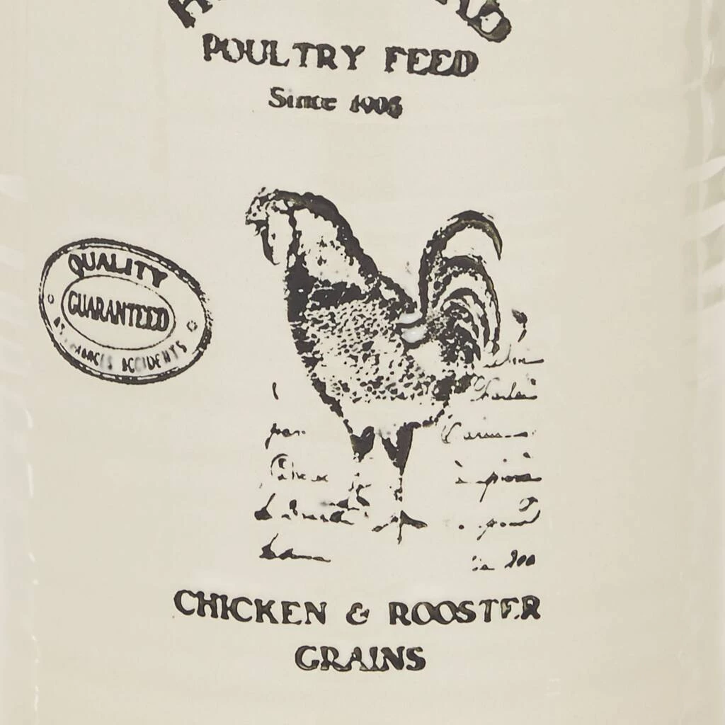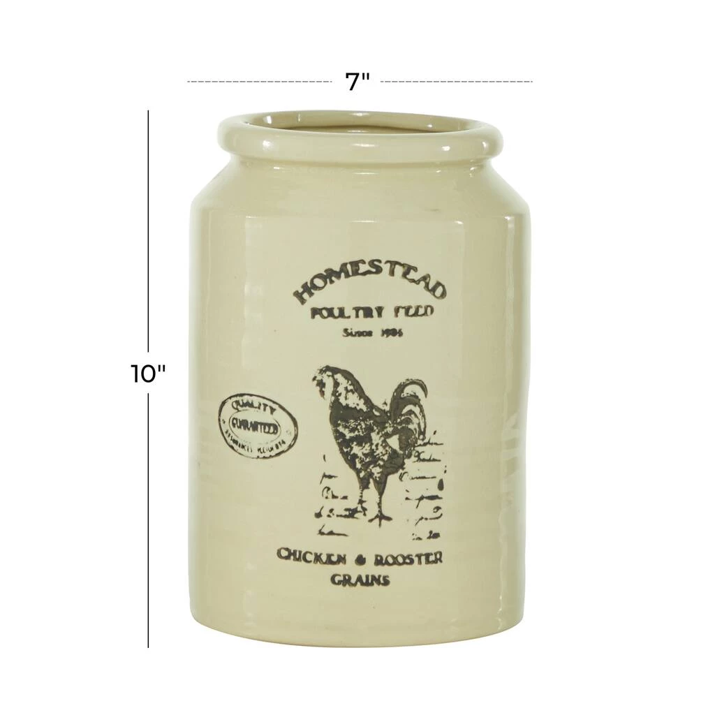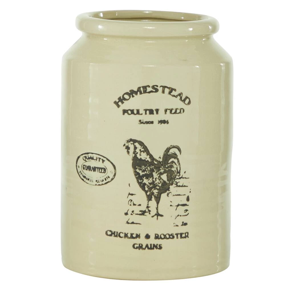 Add charming Farmhouse style to your kitchen decor with this large ceramic cylinder jar. In true Farmhouse fashion, this decorative jar features the serif font script “HOMESTEAD Poultry Feed since 1906” with a rooster illustration, a “Quality Guaranteed” stamp with “Chicken and Rooster Grains” at the bottom. The tall, large jar size makes this a great kitchen jar to store utensils, cooking wares, or any other kitchen supplies you need handy. This item ships in one carton. Suitable for indoor use only. Cylinder vase with wide rim opening. Features a vintage-stamped print with “HOMESTEAD POULTRY FEED SINCE 1905” text and a chicken illustration. Farmhouse-themed style.