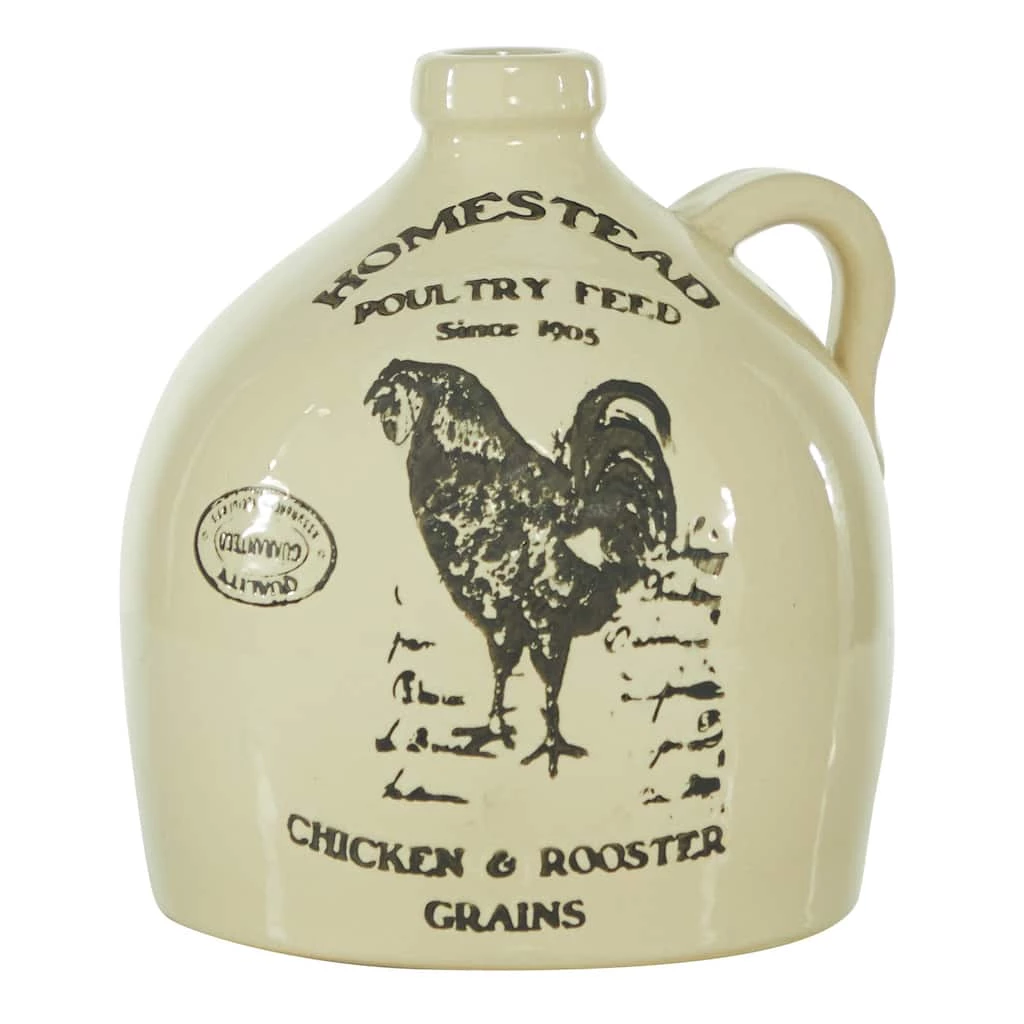 Add charming Farmhouse style to your tabletops with this large ceramic jug. In true Farmhouse fashion, this decorative jar features the serif font script “HOMESTEAD Poultry Feed since 1906” with a rooster illustration and “Quality Guaranteed” stamp with “Chicken and Rooster Grains” at the bottom. Display as Farmhouse accent decor or put a single stem botanical in the top. This item ships in one carton. Suitable for indoor use only. Jug vase with narrow rim opening. Features a vintage-stamped print with “HOMESTEAD POULTRY FEED SINCE 1905” text and a chicken illustration. Farmhouse-themed style.