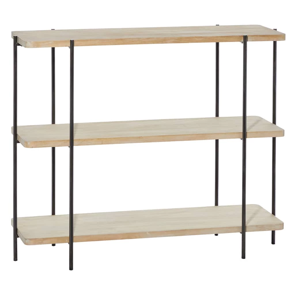 A space saver table with a simple look that can be placed in home entryways or living rooms. Bring a finishing touch to your home with an inviting appeal with this console table. A sturdy and long lasting construction that for a years of enjoyment. Designed with rubber stoppers at the base that prevent scratching furniture and table tops, as well as sliding around. Suitable for indoor use only. Maximum weight limit for shelf is 30 lbs. A contemporary wood and metal console table with 3 wooden shelves. Contemporary design.