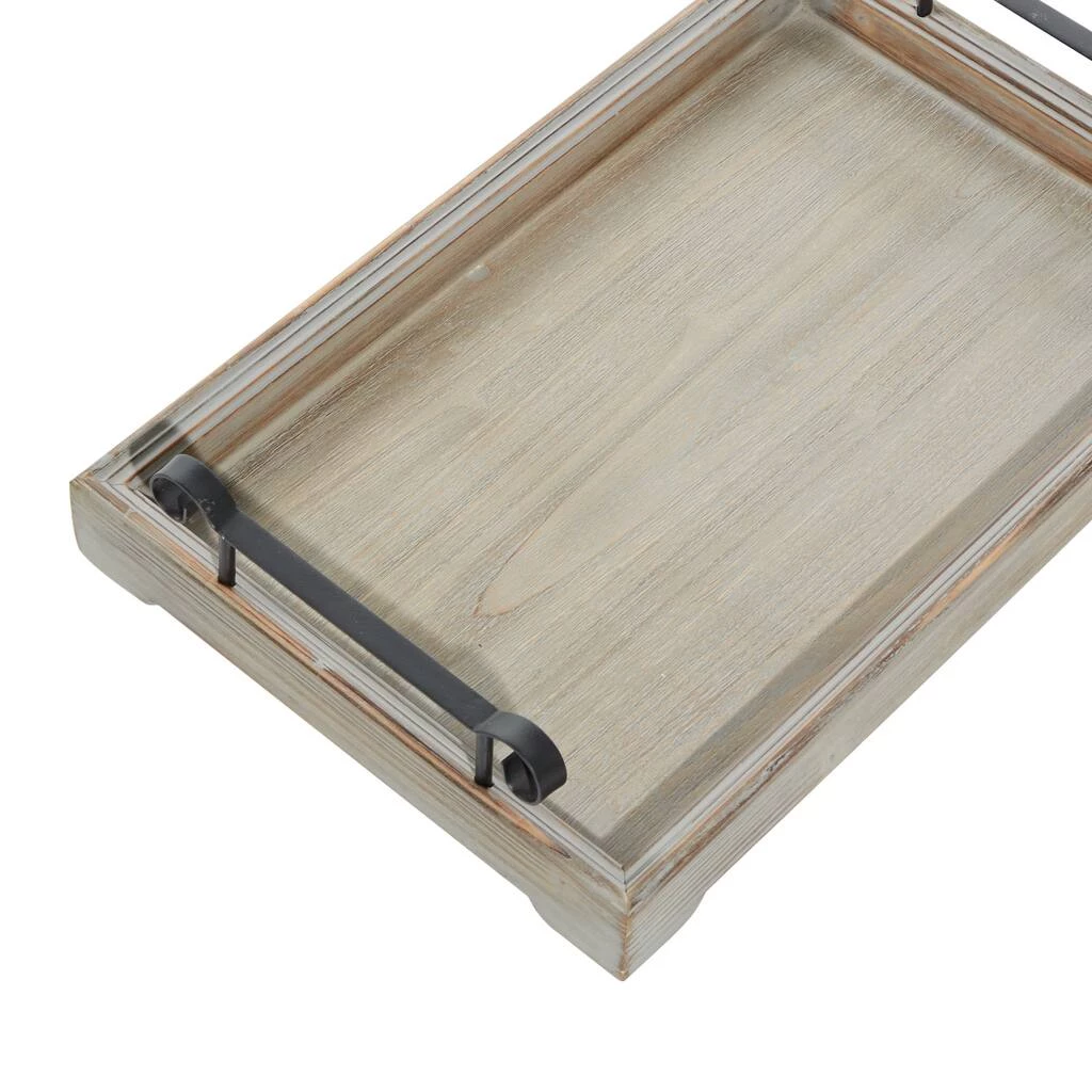 These whitewashed taupe wooden trays with metal handles sets that warm and fresh vibe for your rustic-themed home. Each rectangular tray is carved with beveled side rims that extends to slightly elevated stands. These trays highlight a whitewashed over a natural taupe finish and are accented with 2 metal handles. Use as individual or set of dΓ©cor holders or serving trays on your coffee, console, and kitchen tables, these decorative wooden trays sure are excellent additions to your rustic home spaces.