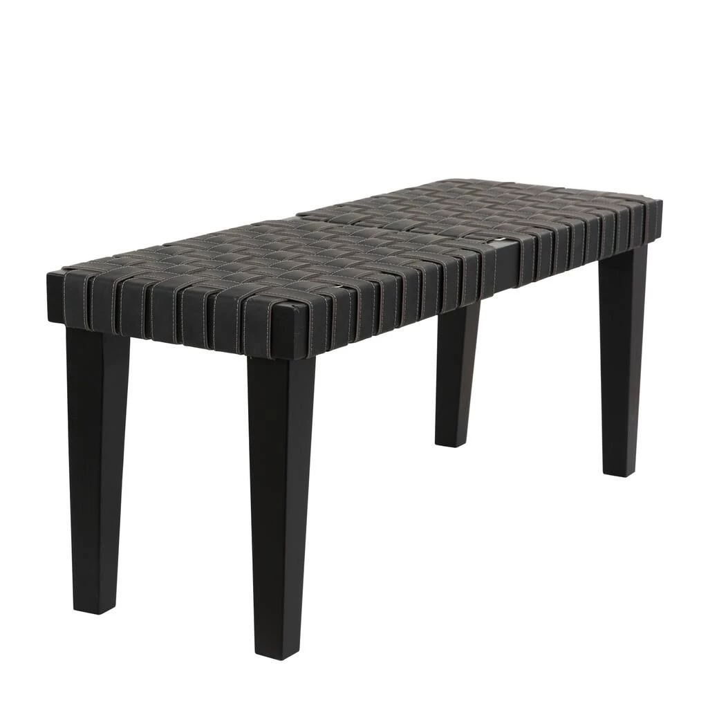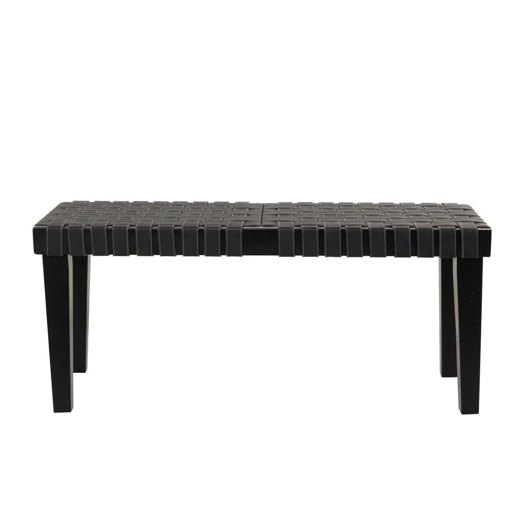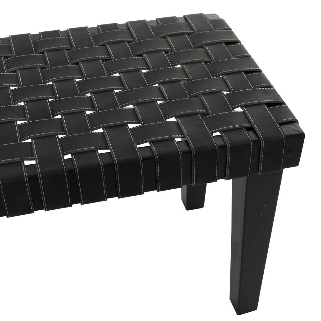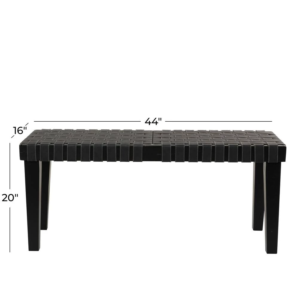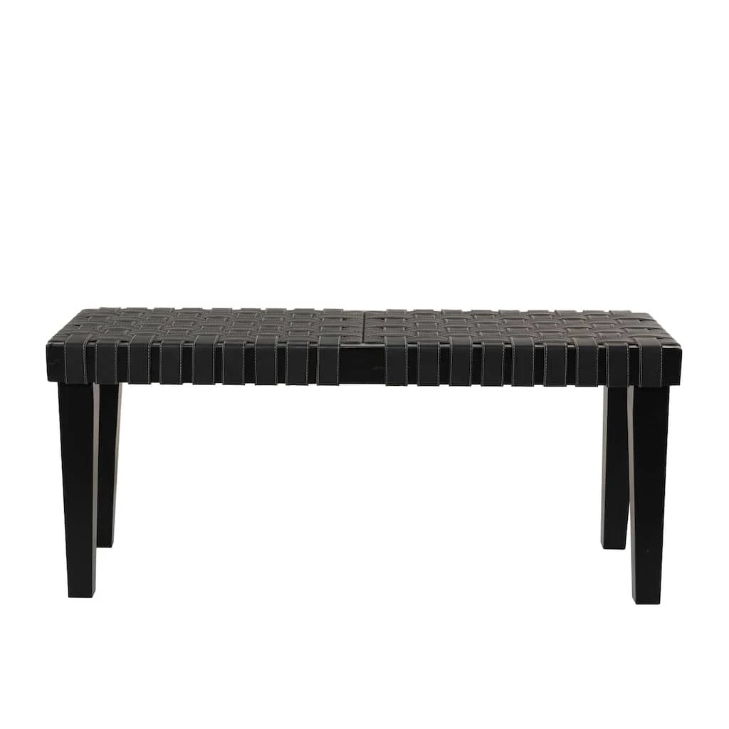 This classic black leather bench seat is a luxurious focal point bench for entryways, hallways, and home offices with striking dark themed furniture pieces. A small piece of furniture that make a big difference to give your home an instance refresh. Create a balanced space in your home for a welcoming and comfortable atmosphere for you and your guests with this bench. Suitable for indoor use. Rustic style.