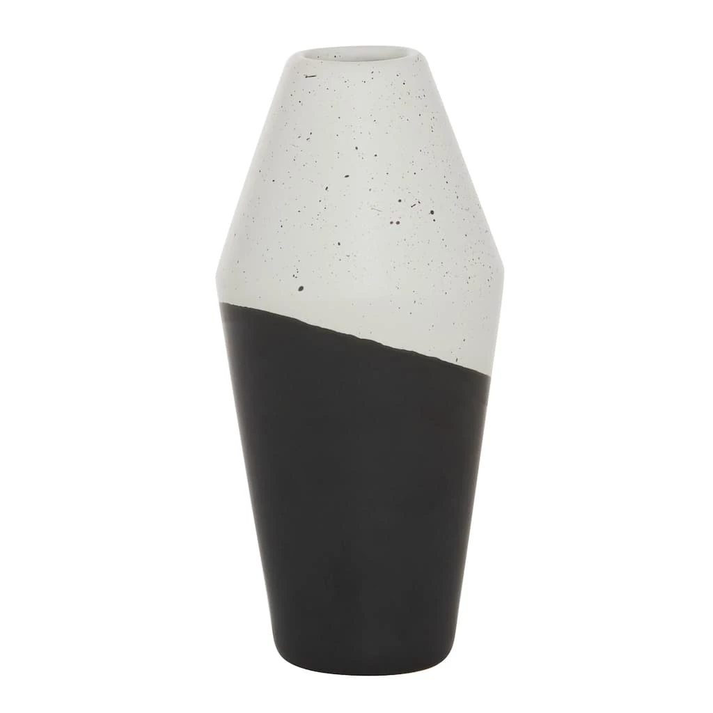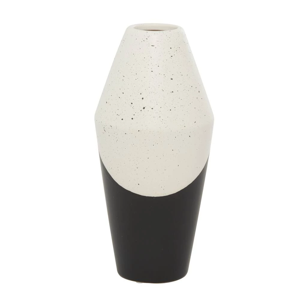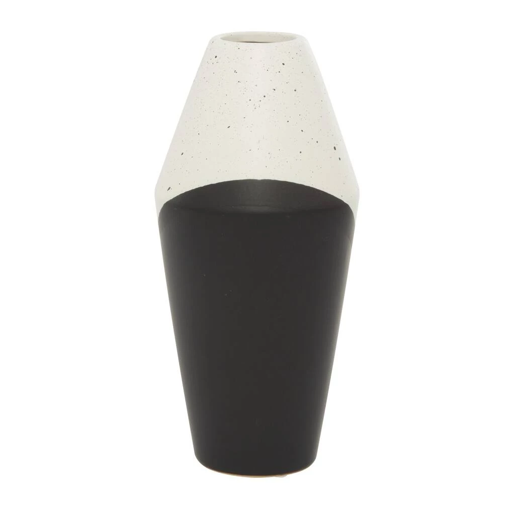 Alone or holding a small bundle of vase filler, this ceramic bottle vase features chic black and white color-blocking over its angled body. The small mouth can display a small bunch of botanicals, but this decorative vase also makes for an eye-catching stand-alone accent decor centerpiece with its bold contrast of diagonal speckled white and solid black-glazed sections. This versatile palette with bold shapes make a cool pattern in modern and contemporary homes and offices. Due to the handmade nature of this item, no two will be alike, there will be slight differences in shape, size, and color. This item ships in one carton. Suitable for indoor use only. Tapered cylinder vase with medium-sized rim opening. Contemporary design.