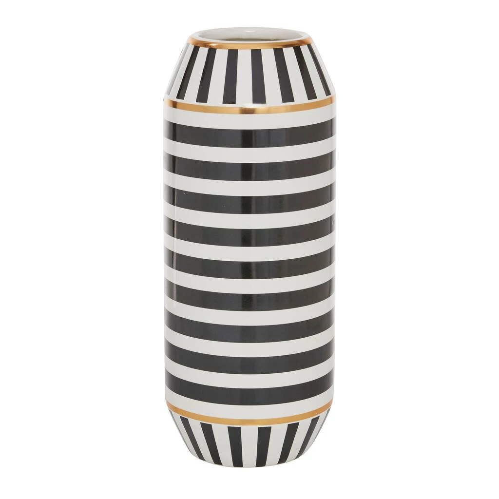 This black and white flower vase with capsule container shape was made from dolomite, painted with bold decoration, and given a glossy finish to suit contemporary and modern interiors. It works as a vase, as a decor holder, and as a tabletop exhibit, offering both style and function to such dynamic themes. The vase stands 16″ tall and is best used as a standalone decor or with faux flowers or botanical. Designed with white rubber stoppers at the base that prevent scratching furniture and table tops, as well as sliding around. Suitable for indoor use only. Vase does not have drain holes. Capsule container-inspired vase featuring a round 3. 60βD mouth opening. This item comes shipped in one carton.