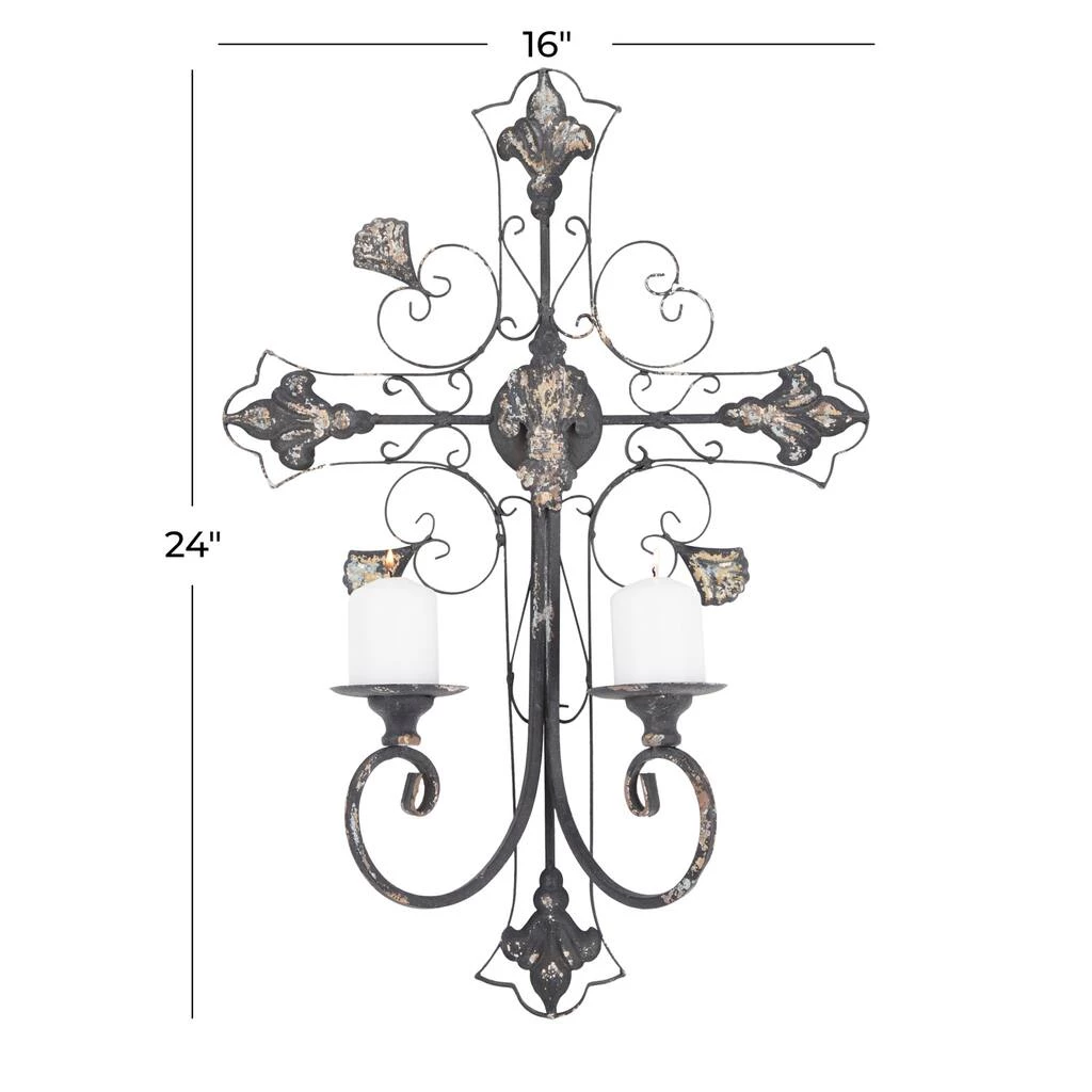 Place this on any blank wall space adding both texture and depth to your home. Create a balanced space in the most creative way with this expertly crafted wall dΓ©cor for captivating focal point. Light up your hallways with this wall sconce candle holder to bring together the French country theme of your indoor aesthetics. Furnished with 2 disc that holds one pillar candle each. This item comes shipped in one carton. Easy display with 2 keyhole hanging hooks. Suitable for indoor use only. French country design.