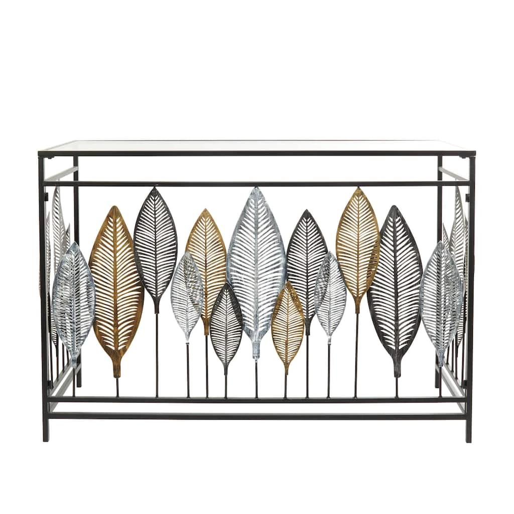 Bring a finishing touch to your home with an inviting appeal with this console table. A sturdy and long lasting construction for a years of enjoyment. Add style and storage space in your Livingroom or entryway with this chic console table features a transparent glass table top encased in black metal frame with leaf accents. Designed with rubber stoppers at the base that prevent sliding around as well as scratching the floor. This item ships in 1 carton. Suitable for indoor use only. Holds up to 100 pounds. Contemporary Style.