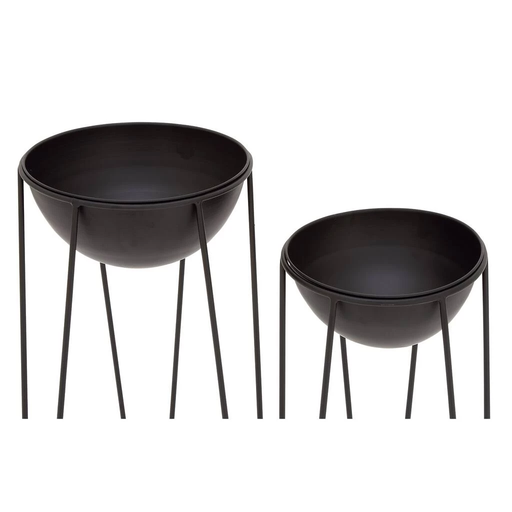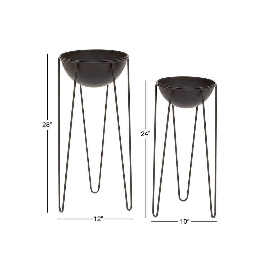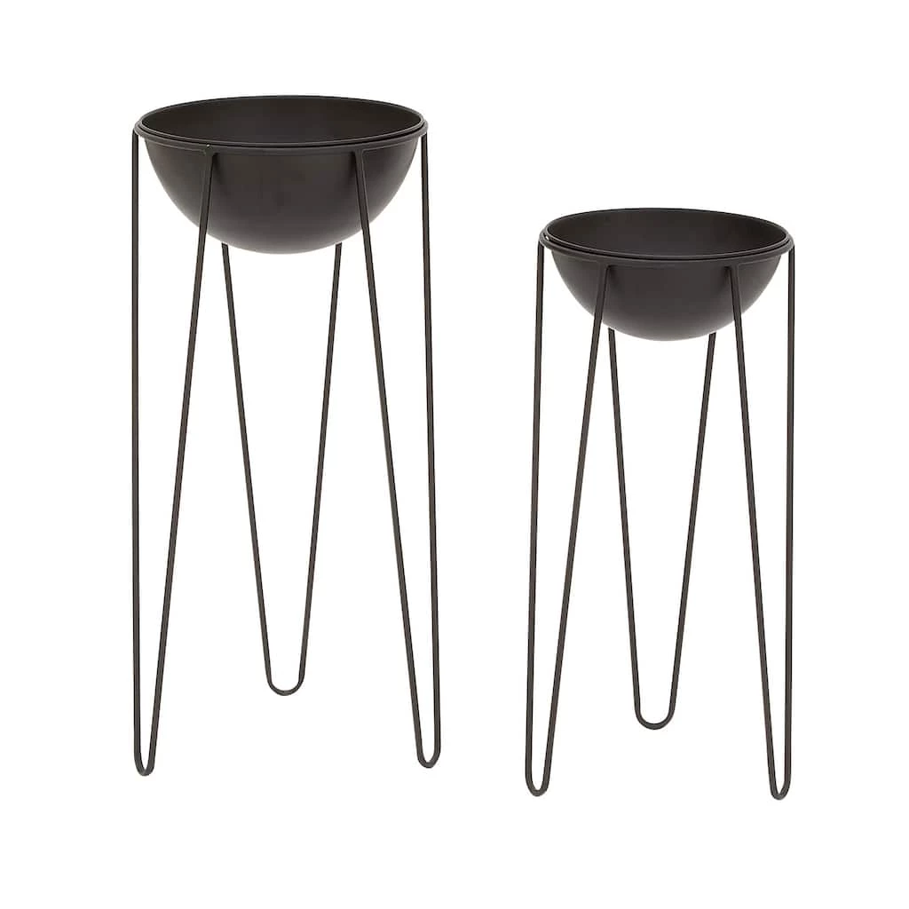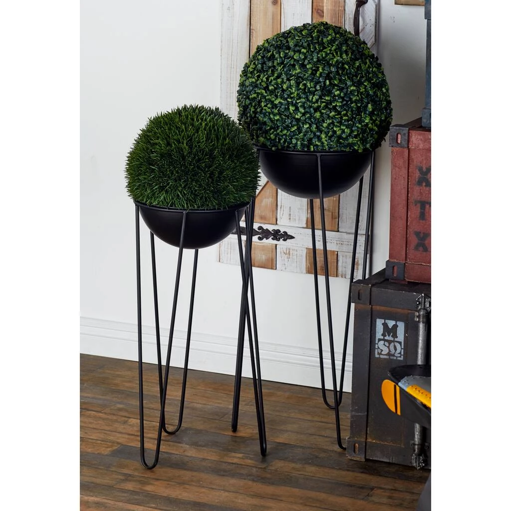 Indoors or out, these black planters add a fierce contemporary accent to your space. Each metal planter has a large bowl sitting in a black iron tripod plant stand with triangular legs. Fill each decorative planter with decorative faux plant balls for your indoor space or flowing pothos on your deck or patio!