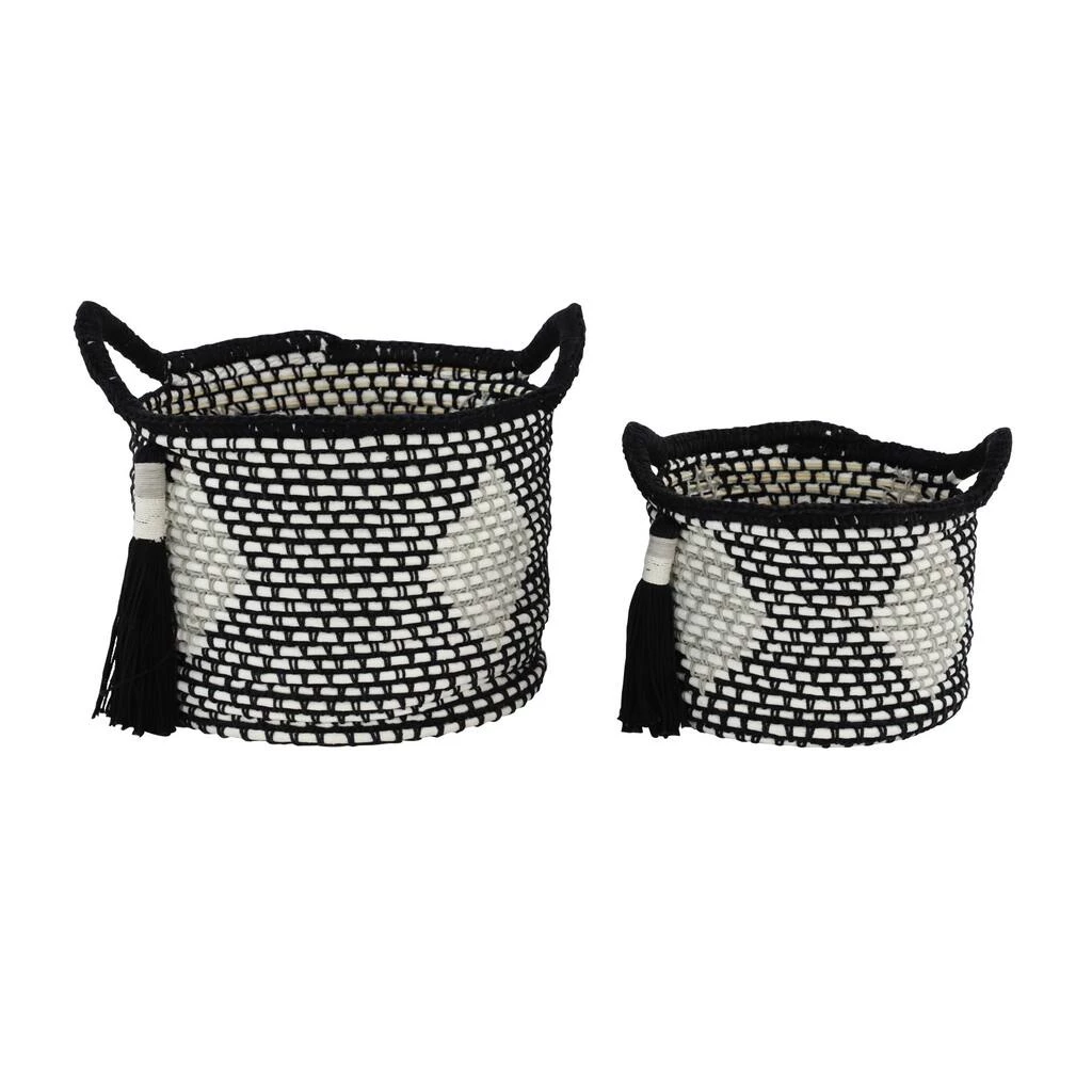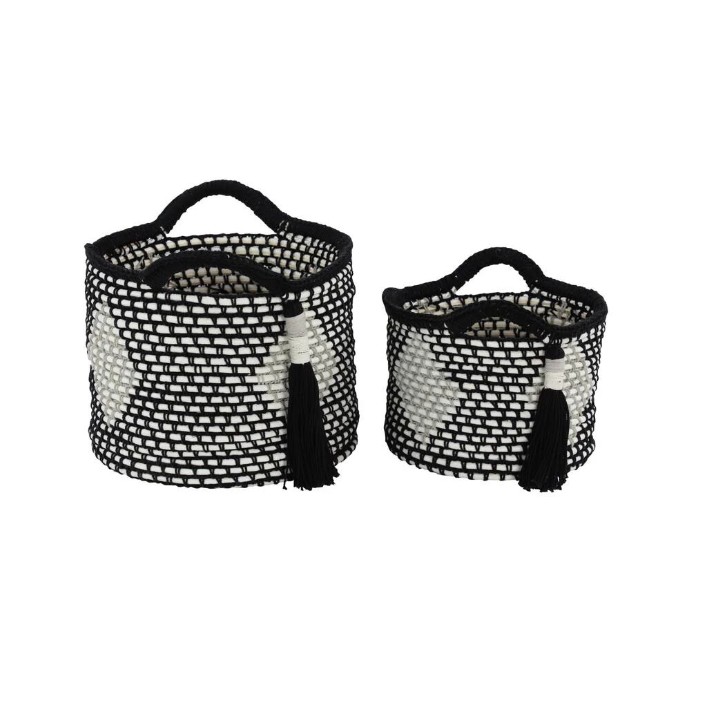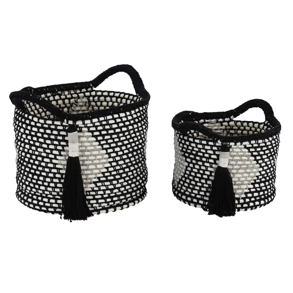 Soft textures and unique adornments dress these 2 hand-woven, large, round storage baskets. These round baskets have a soft fabric soft look and are handmade from dense white cotton ropes. Black yarn wraps and weaves around each cotton cord, creating a striped and checkered pattern throughout the baskets, and decorative diamond designs are woven with light gray yarn for an extra eclectic touch. Black yarn coils around the baskets’ rims that jut up to form 3” curved handles with an oversized black tassel wrapped with beige and white color-blocked yarn around the top.