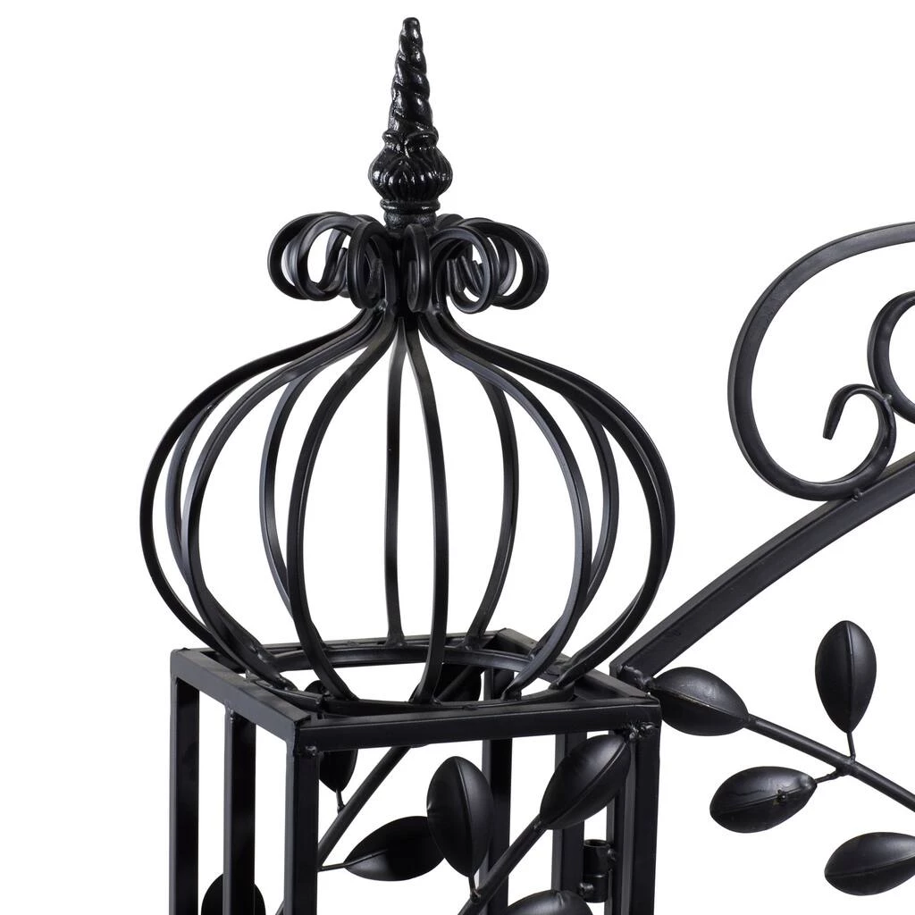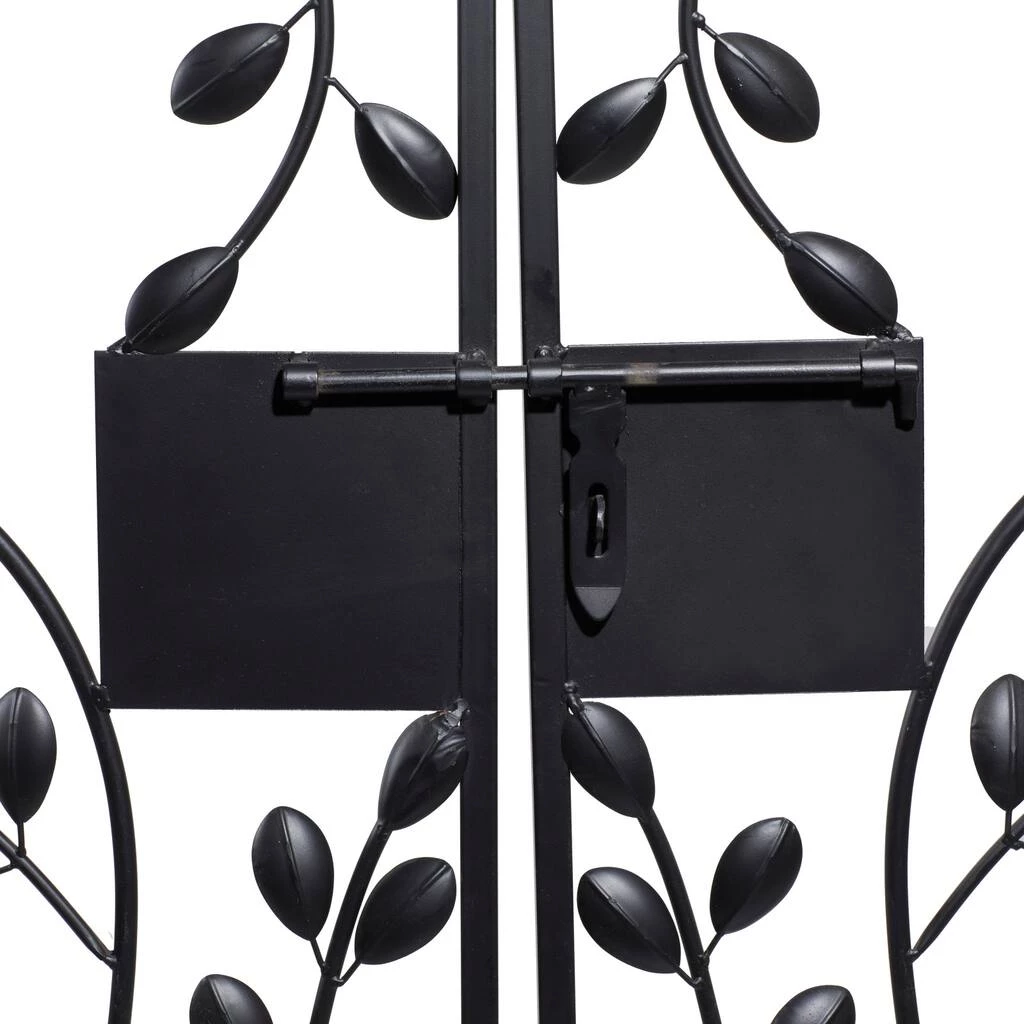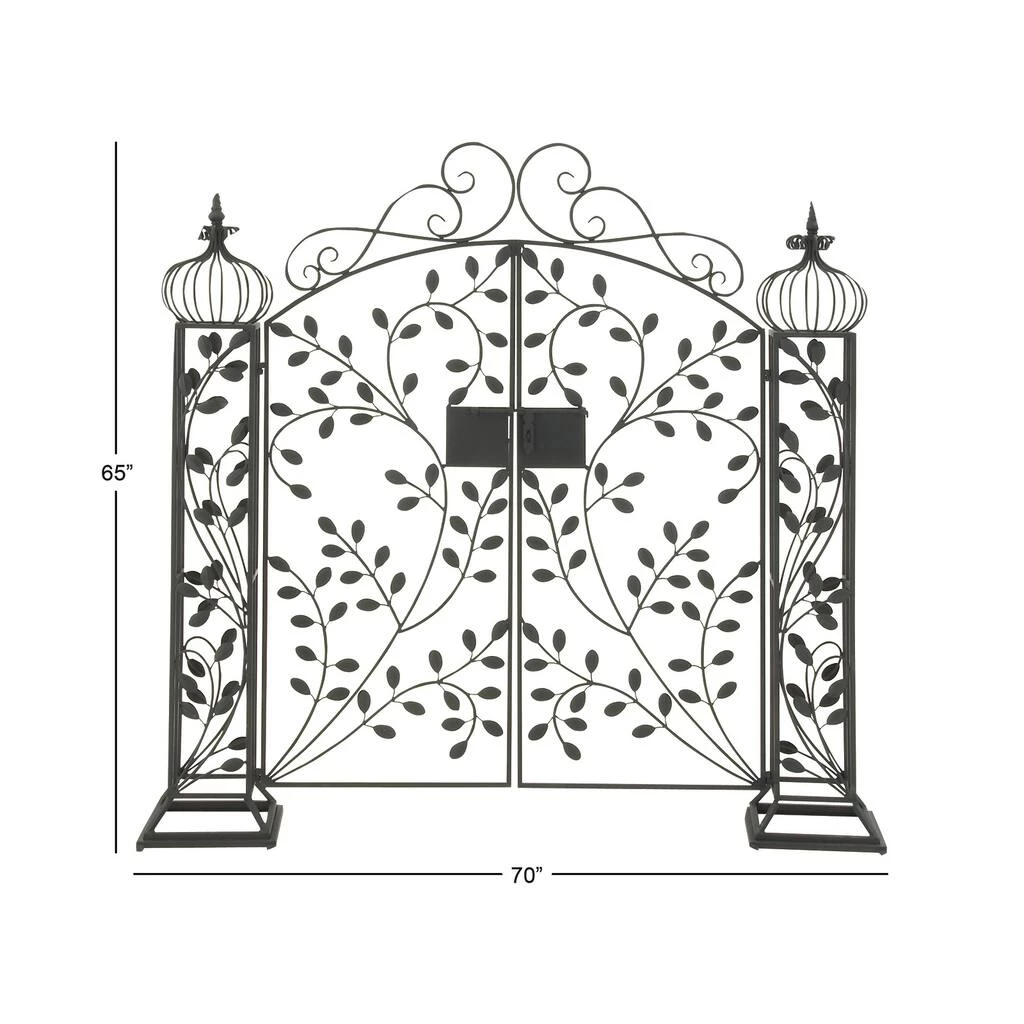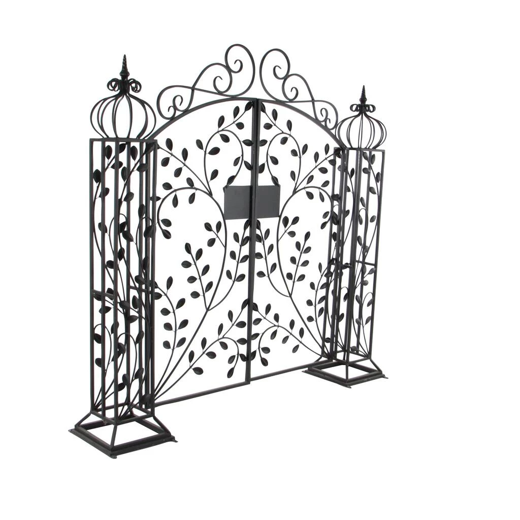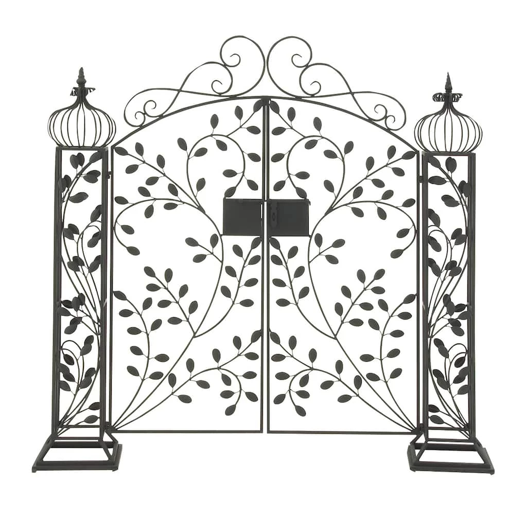 A lovely decorative accent, this metal gate is sure to add bundles of charm to your garden. Beautifully detailed, it is designed with spire finials, scroll flourishes, and cut-out leaf design. It comes with a black classic finish and provides two doors that can be secured by a lock latch. This garden gate is made out of tin with solid construction that offers durability and stability. Jazz up traditional themed gardens with this charming arbor that is ideal for outdoor use. Use this decor to create a stunning entryway to your garden Wipe clean with a dry cloth. Suitable for indoor and outdoor use. Some assembly required. Traditional style. This item comes shipped in one carton.