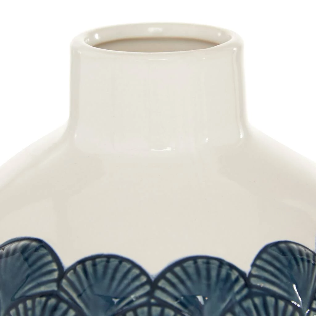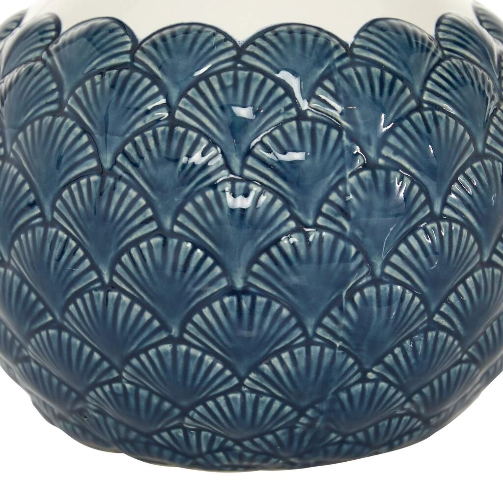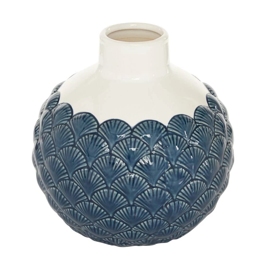 This elegant ceramic vase brings pastoral charm to your home, decorated with engraved art deco-style fan patterns around the bottom portion, finished in a glossy dusty navy blue. The top part of the rotund vase has a very wide, tall neck with no lip. Display solo or with some decorative vase filler in your entryway, living room, or dining room to add a French Country feel with muted, versatile tones. This item ships in one carton. Suitable for indoor use only. Tapered neck bottle vase with medium-sized rim opening. Coastal design.