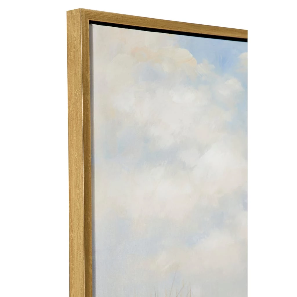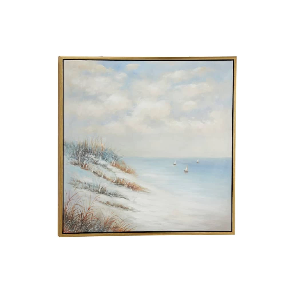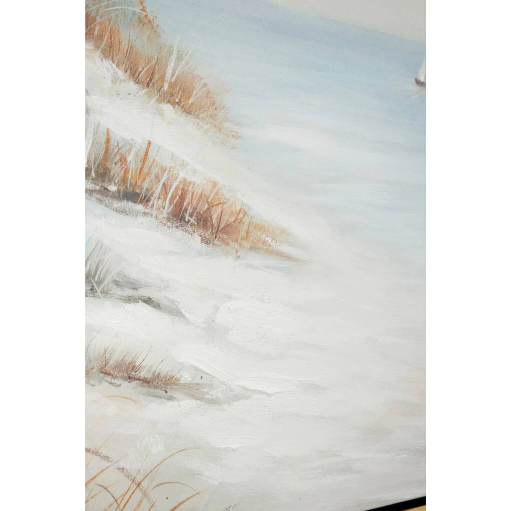 This large acrylic painting of a beach landscape is a must-have in any coastal style space. Tranquil yet potent with movement, this ocean painting is very textural with thin, fine brushstrokes capturing the texture of the seagrass billowing in the breeze, impasto brushstrokes creating wet sand, and soft, blended brushstrokes forming the dreamy sky and sea. Three very small sail boats are painting floating in the distance. The neutral beige, blue, crème, white, and rust-colored tones emanate the colors of the shore and work with other neutral color palettes in your home. This large beach painting looks especially dynamic when placed under spotlights. Sawtooth hangers on the back for fast and easy hanging. Suitable for indoor use only. This item comes shipped in one carton.