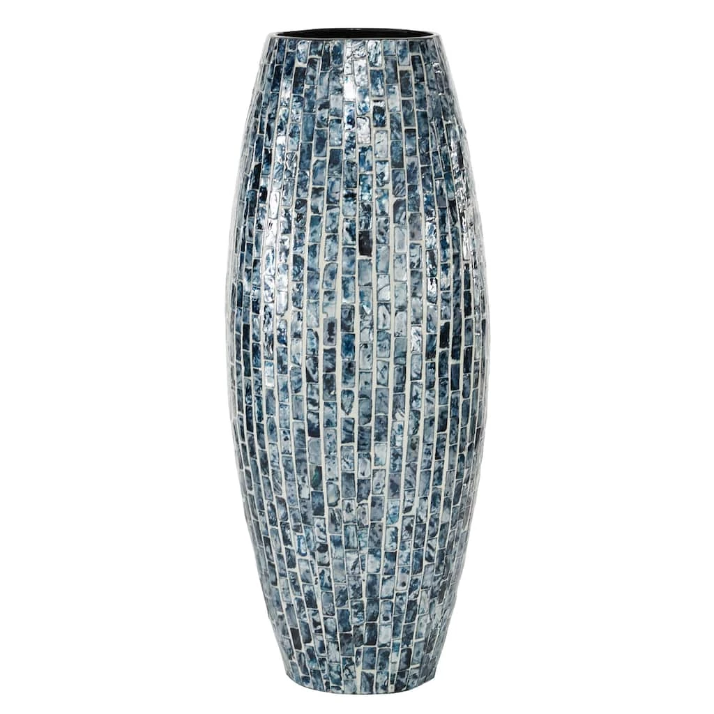 A mosaic of windowpane oyster shells covers the wooden body of this flower vase from Vietnam, making it a good match with blue and coastal-themed interiors. Put flowers in it, or use it as stand-alone tabletop decorations. It also captures attention on top of wall dressers, on shelves, and next to wall mirrors. Due to the handmade nature of this item, no two will be alike, there will be slight differences in shape, size, and color. Suitable for indoor use only. Vase does not have drainage holes. Vase measures 5β mouth openings. This item comes shipped in one carton.