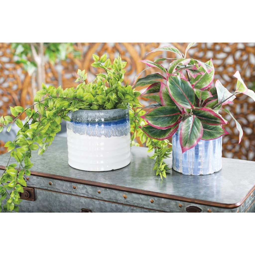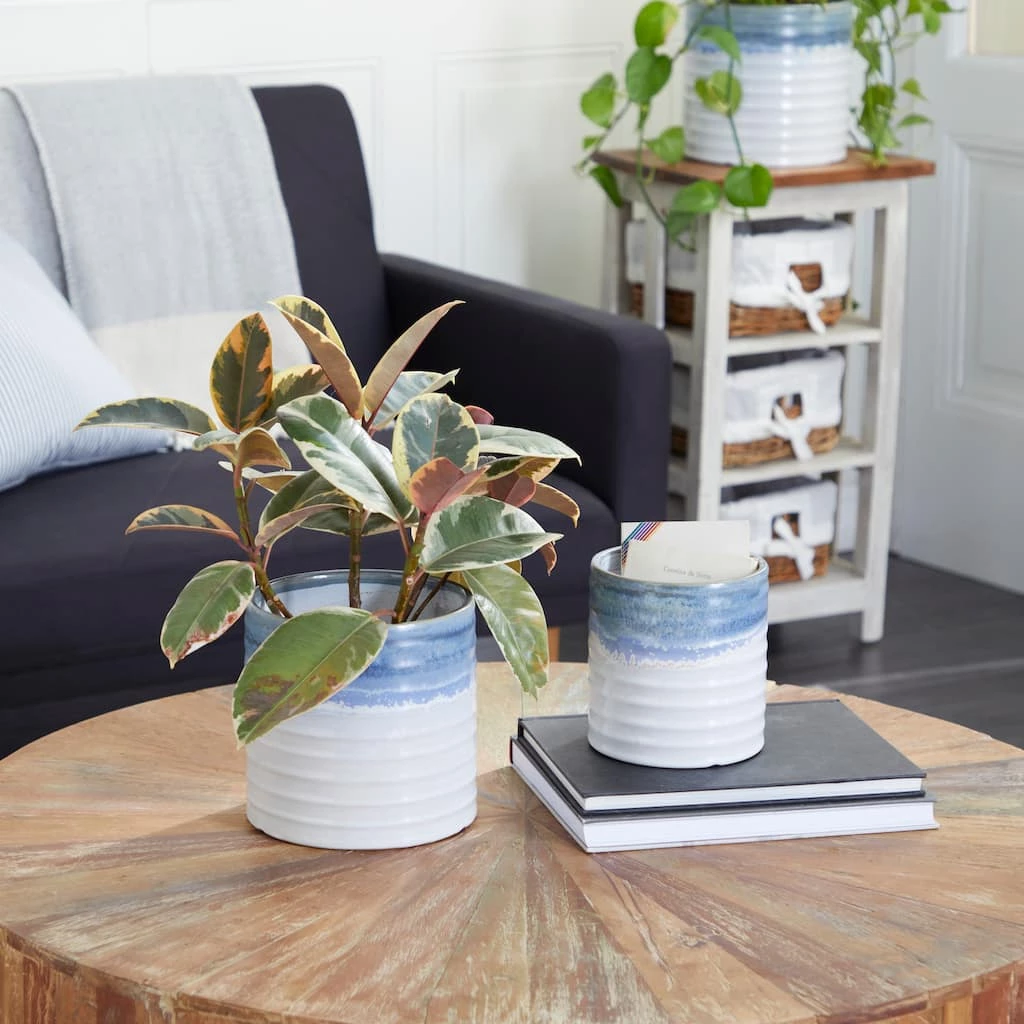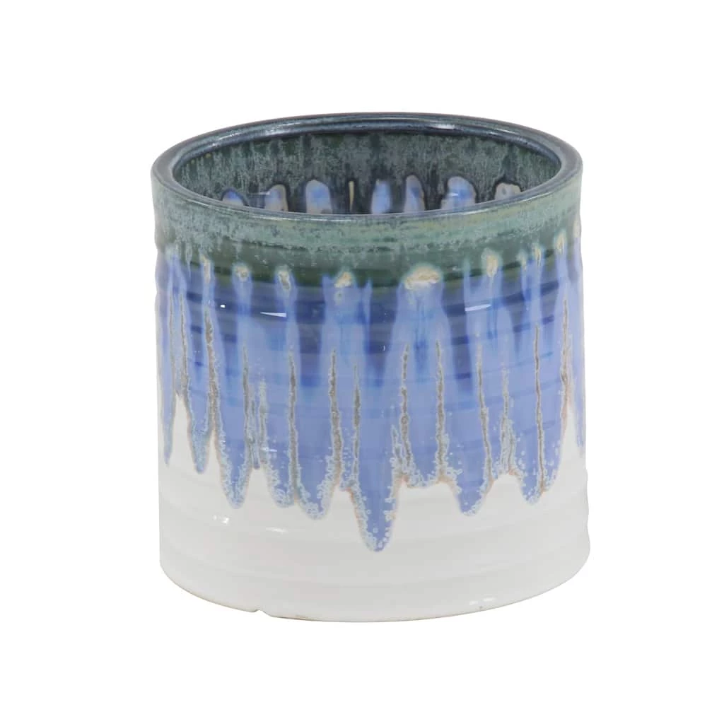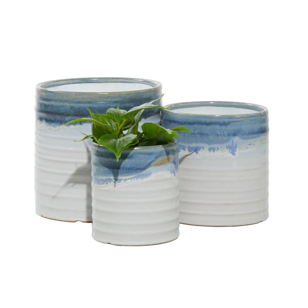 Crafted in ceramic, this 3-in-1 ceramic planter set features horizontal ridges and dripping blue paint on cylindrical bodies. Such a creative approach to exterior elevates the seaside look and feel of coastal-themed gardens and homes. The porcelain planters in this set do not have drain holes. These stylish ceramic plant holders are great additions to gardens, patios, and living spaces with a coastal theme.