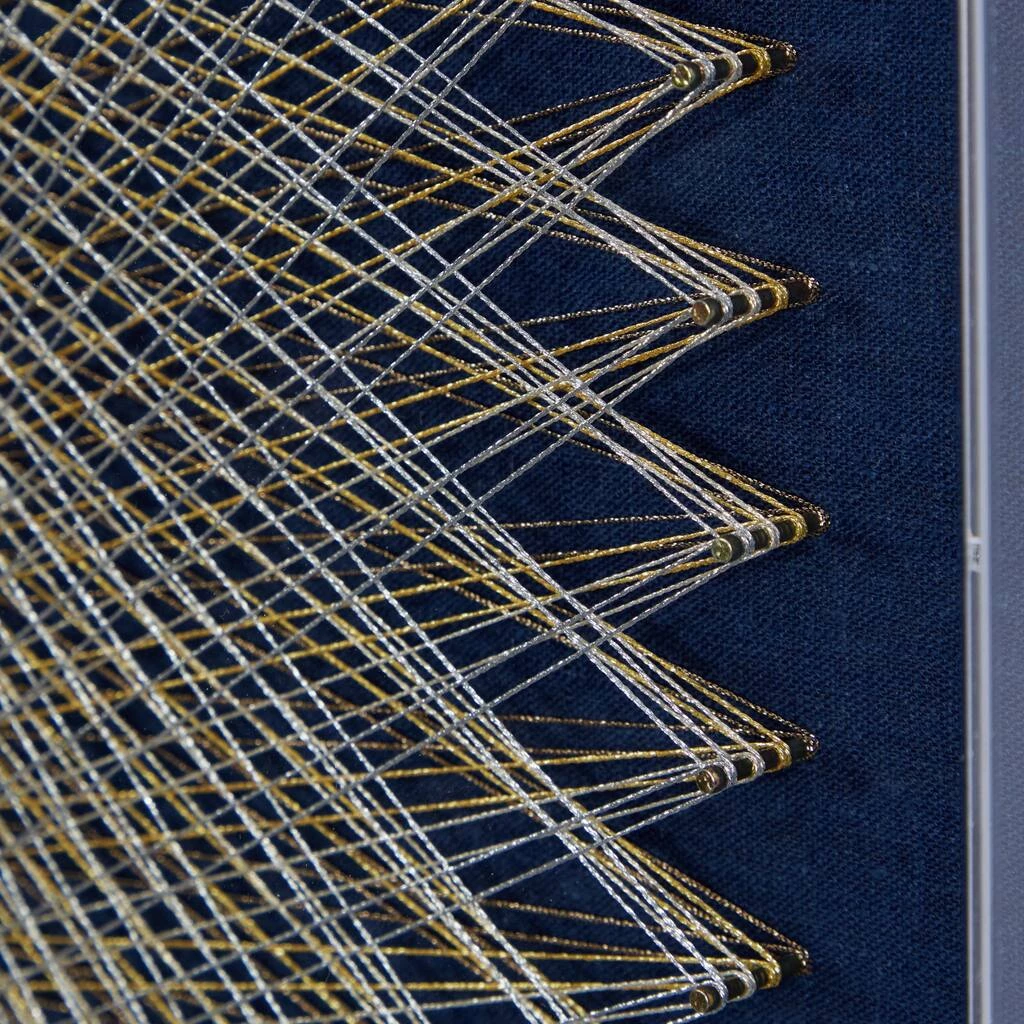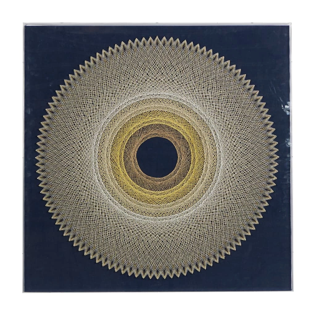 Amp up your contemporary space’s style with this large geometric wall decor featuring 3D string art. The navy blue canvas backing holds four round, intricately detailed mathematical roulette curve geometric string designs. These string spirals are crafted from white, beige, gold, and brown string. Showcase this large string wall decor piece anywhere needing a style boost with depth and dimension. It makes a great centerpiece over your sofa or in your dining room. This item ships in 1 carton. Due to the handmade nature of this item, no two will be alike, there will be slight differences in shape, size, and color. Easily hanging using hanging loop hardware on the back. Suitable for indoor use only. Contemporary design.