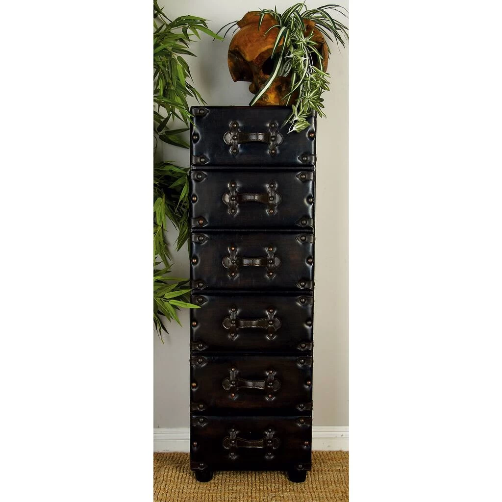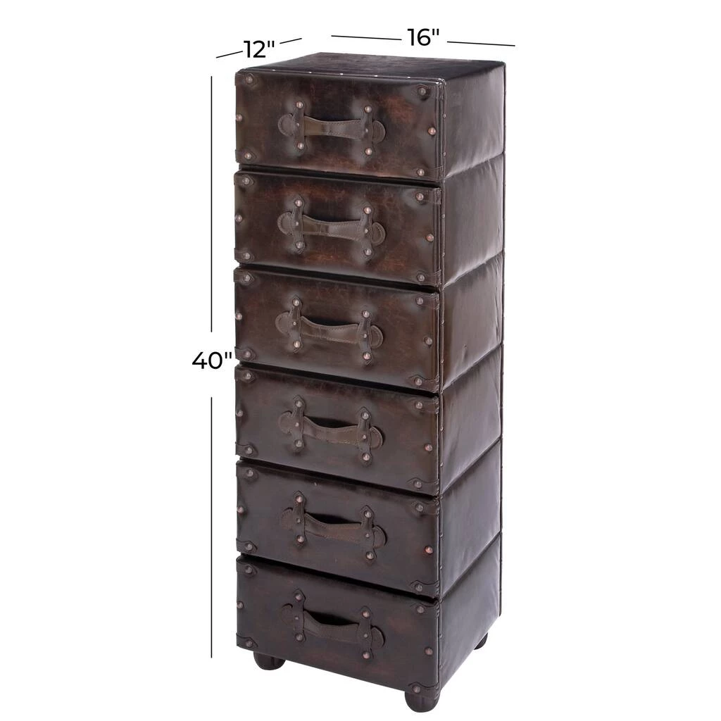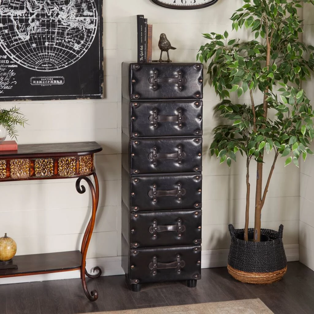 Useful and elegant, chests are more than just a place to store clutter and place a lamp. Add a unique stylish storage to your living room, hallway, or bedroom with this chest. This drawer cabinet is ideal for vintage, retro, and traditional antique-themed living spaces. This item comes shipped in 1 carton. This wood and leather chest features 6 drawers with 14″L x 10.31″W x 6.37″ measurements. Suitable for indoor use. Each drawer can hold up to 25 lbs. Traditional theme.
