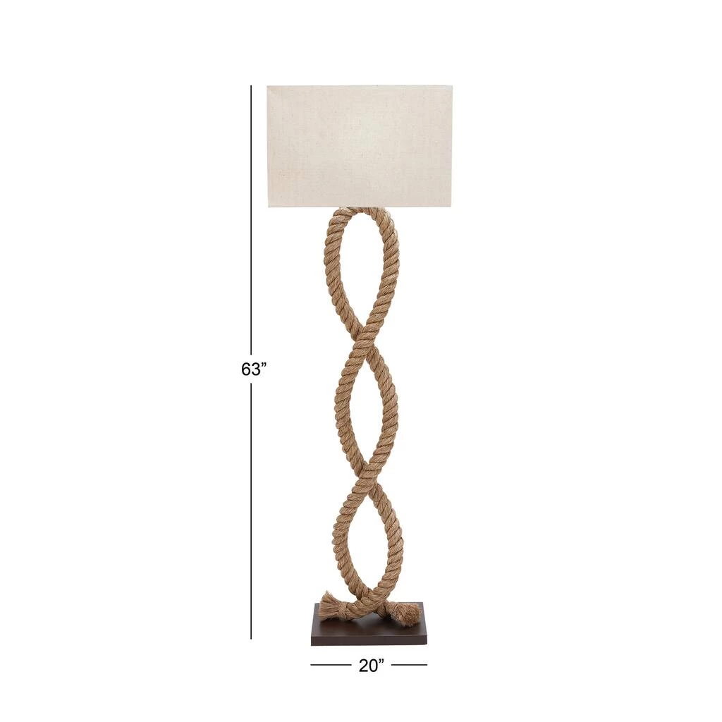Achieve true coastal style with this tall jute rope floor lamp. The body of this tall lamp is all jute rope, twisted into a figure 8 design and held firmly in place by iron. The rope body adheres to a flat, dark brown, rectangular base, and the top is covered with a rectangular white lampshade. A true statement piece while illuminating your rustic style space. Uses one standard E26 light bulb (not included). This item has a 75β cord length. Suitable for indoor use only. A rectangle shaped shade made of fabric. Convenient foot switch for easy on/off. This item ships in two cartons.
