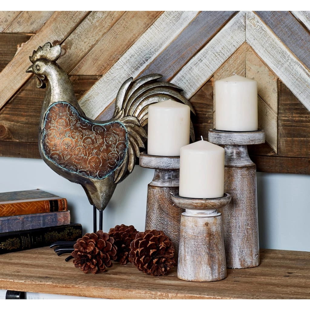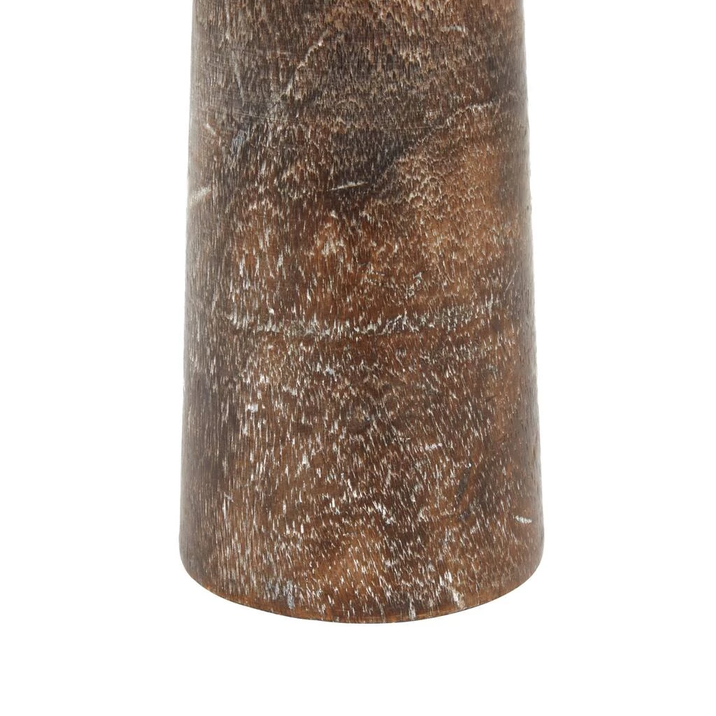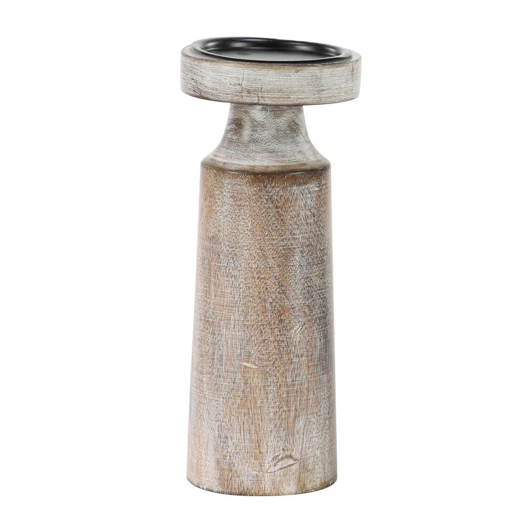 Rich in natural beauty, this trio of small natural wood candleholders feature lovely natural wood grain throughout their stout cylinder bodies. Each wooden candlestick is carved from natural mango wood from India with mocha brown hues peppered with flecks of textural wood grain that are highlighted by light whitewashing. Round iron candle plates inset to the wooden tops hold your pillar candles in place (not included). These candle holders come designed with black rubber stoppers at the base that prevent scratches on furniture and tabletops, and keep them from sliding around.