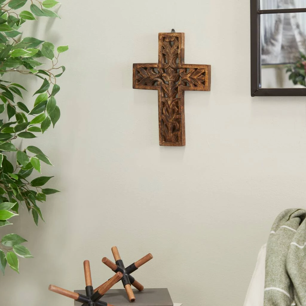 Intricate carving designs with structured border add traditional classic appeal to your space. Let faith guide your way, put this delicate piece on this display to create a wholesome ambience. Made with a sturdy wood structure, it is perfect for creating an elegant atmosphere above your table top or mantel. This item ships in one carton. Suitable for indoor use only. Made in India. Traditional theme.