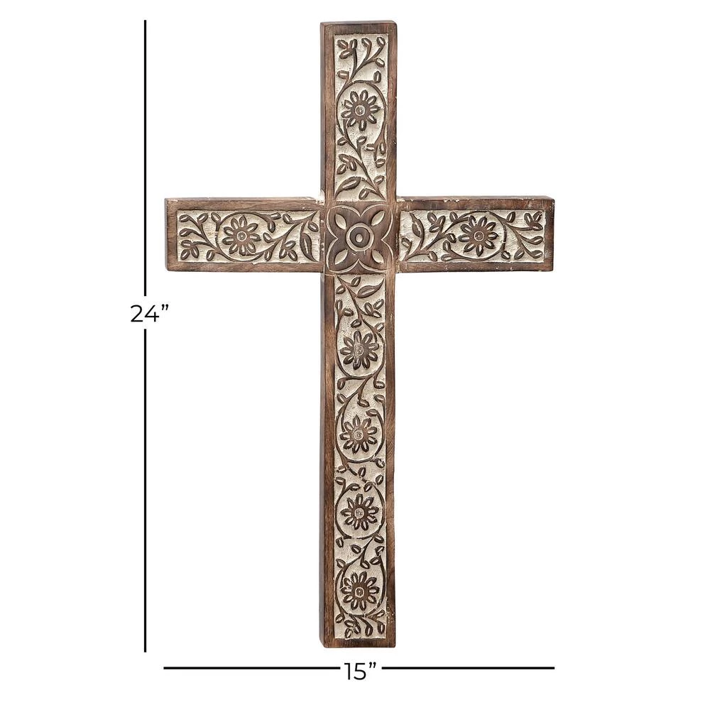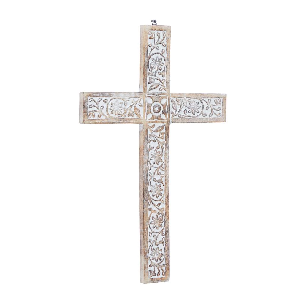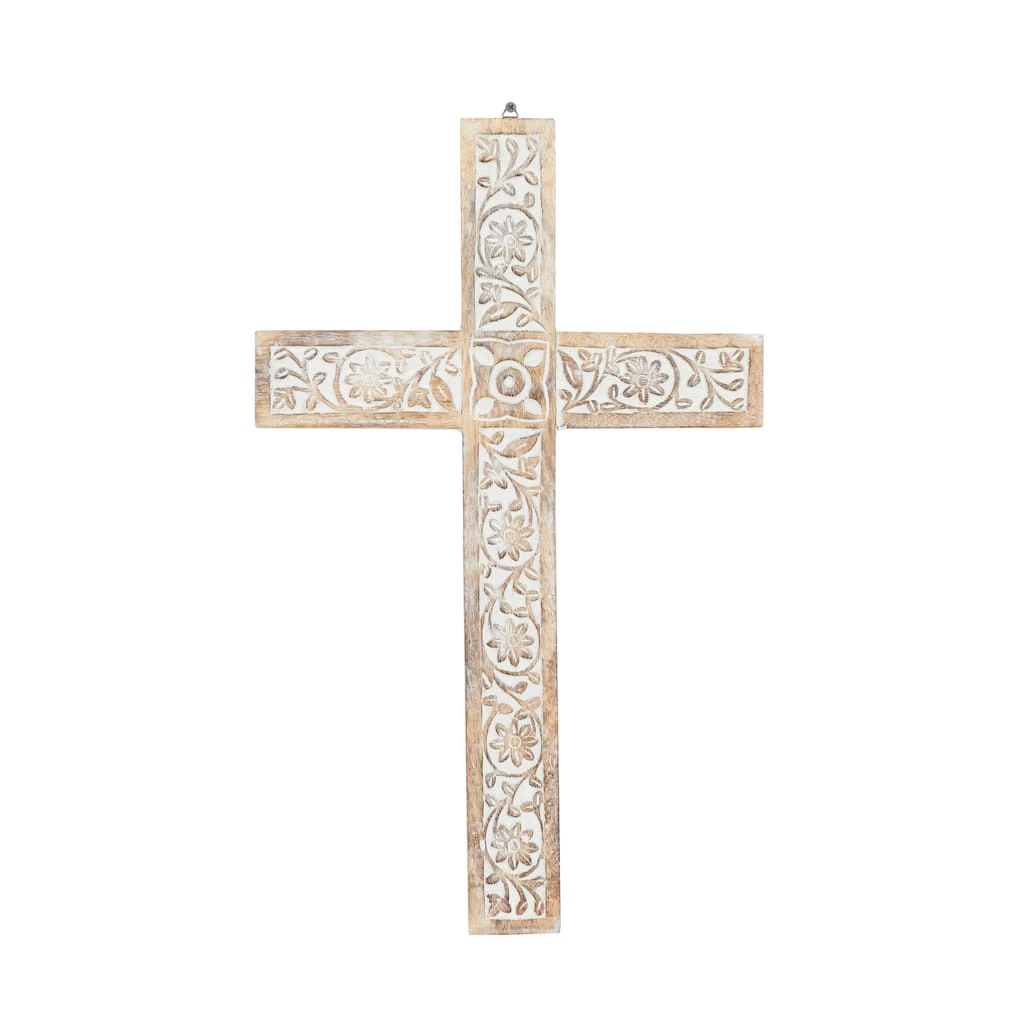 Add a touch of spirituality to your space with this gorgeous cross wall decor. Made in India, the decorative cross features elegant floral patterns carved on a mango wood body. The cross is 24″ tall and 15″ wide, making it an eye-catching addition to your wall. A beige and brown finish allows it to fit in with traditional- or rustic-style decorating schemes. This item comes shipped in one carton. Item comes with metal loop for easy and secure hang. Suitable for indoor use only. Made in India. Traditional theme.