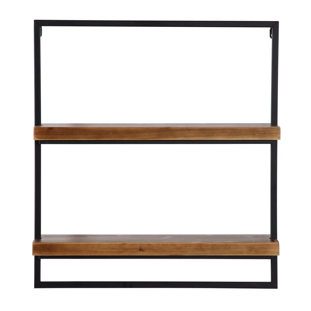 Simple yet stylish, this metal and wood wall rack has a modern shape with a bit of farmhouse feels from the wood and metal combo. Two sturdy shelves made from fir wood and MDF are housed in a dark gray iron frame that securely hangs from your wall with keyhole hardware in the back. Perfect for displaying and storing small items in your kitchen, bedroom, living room, or office, this wall shelf serves purpose with contemporary style. This item comes shipped in one carton. Securely hang from keyhole hardware. Suitable for indoor use only. Holds up to 20 lbs. Designed with an industrial theme.
