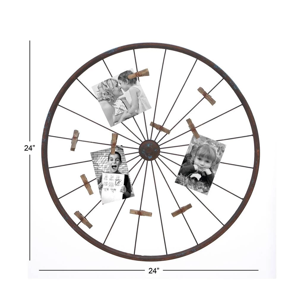Decorative rust over the silver metal adds a textural vintage touch to this metal bicycle wheel wall dΓ©cor. It mainly functions as a wall-mounted photo holder with the spokes scattered and the inclusion of wood clothespins to clip memorabilia prints.