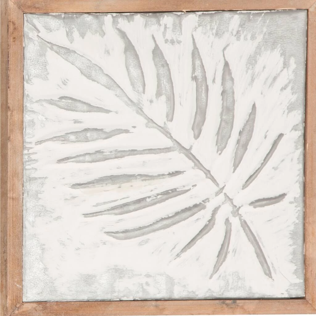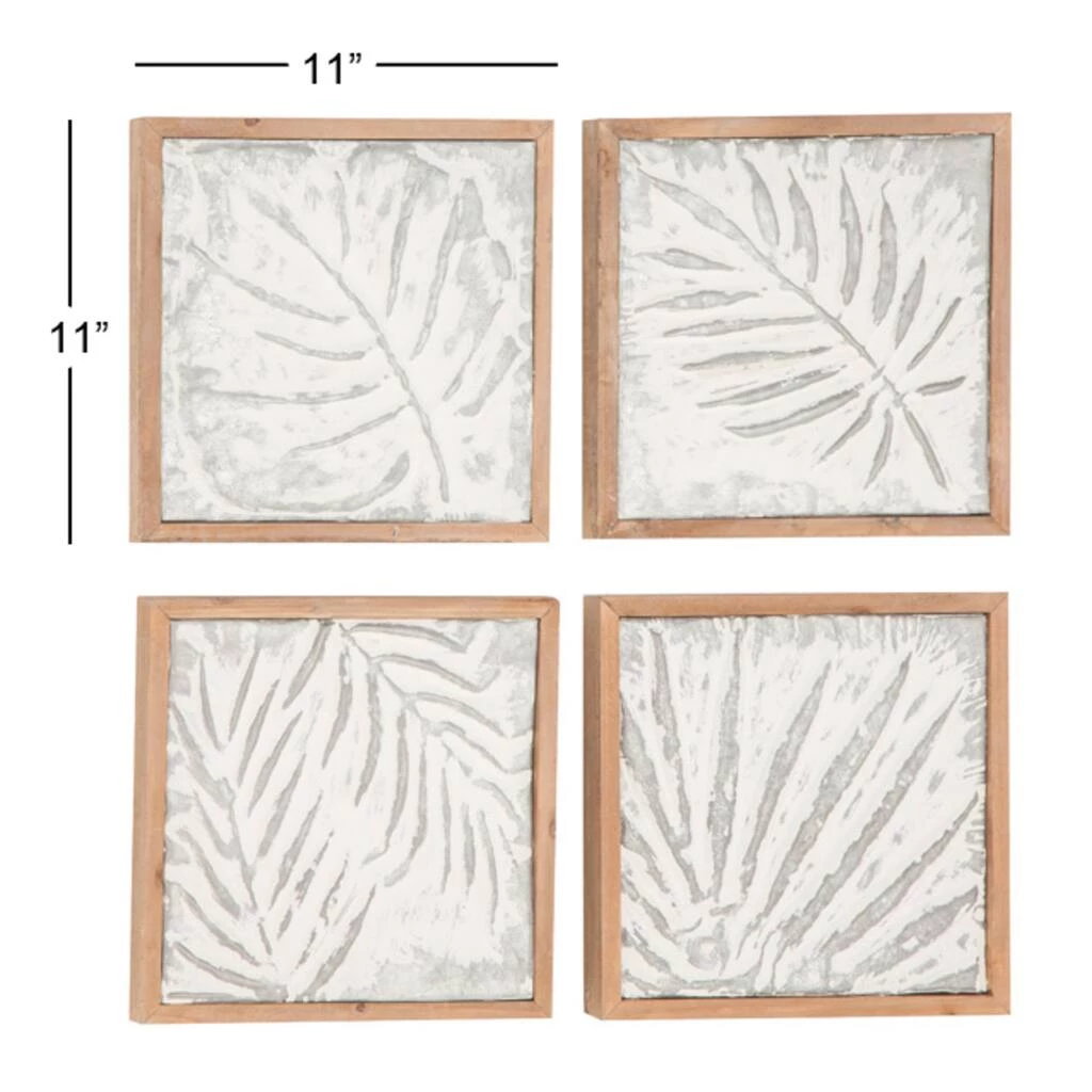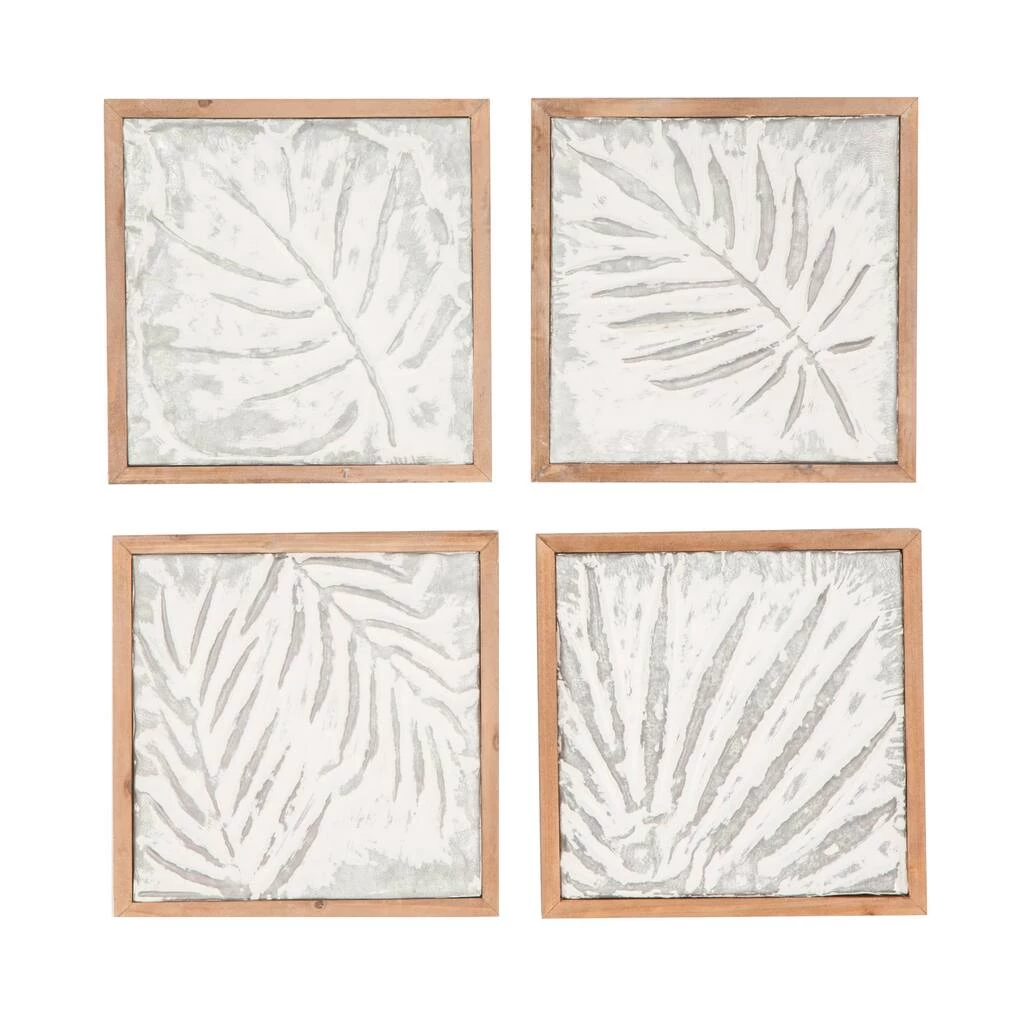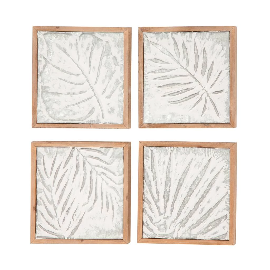 Elevate a rustic themed home with this metal wall art in wood frames. The wall decor set features four panels of fossil leaf imprints with a white and gray finish. Each metal panel has a wooden frame made from Chinese fir with a natural brown finish. Use as charming wall accents to highlight the warm and cozy touch of farmhouse interiors.