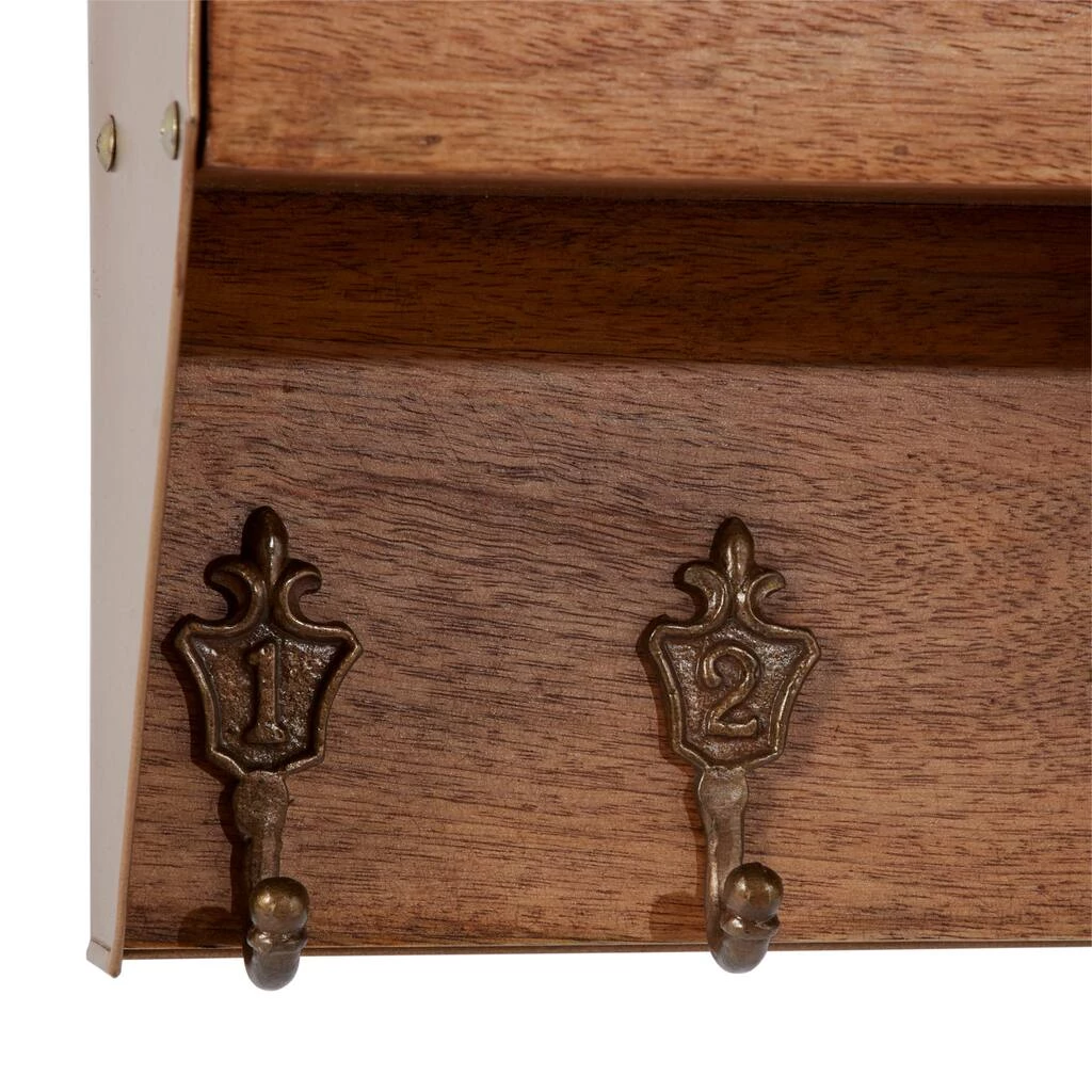 Great for tight spaces and sprawling walls alike, this tall natural golden brown mango wood wall shelf has compact cubbies for mail, keys, and other small items you want to keep track of in style. Beneath the shelves are 3 numbered iron hooks, great for hanging your bag and sweater when you walk in the door. The versatile earth tones work with any color palette and bring warmth to your space. This item comes shipped in one carton. Ready to hang by sawtooth hardware in back. Suitable for indoor use only. Holds up to 20 lbs. Made in India. Designed with an industrial theme.