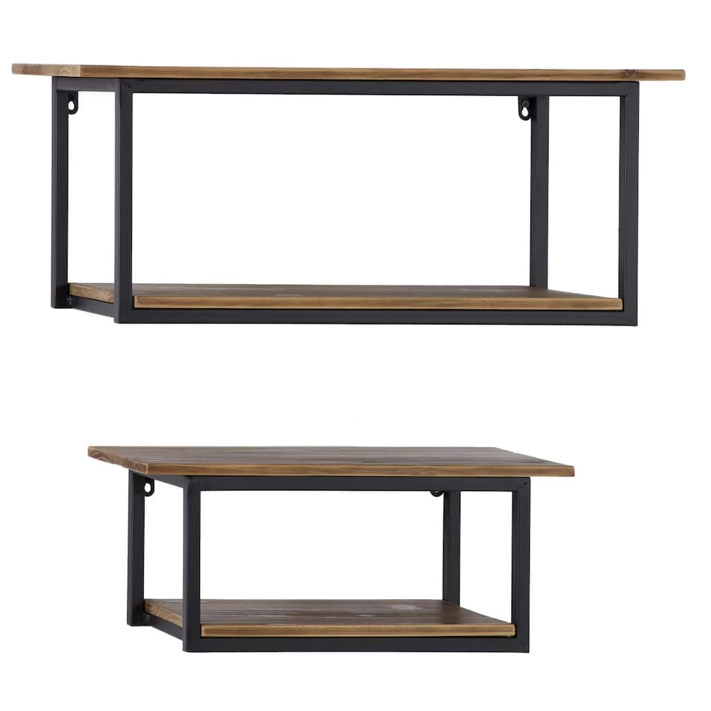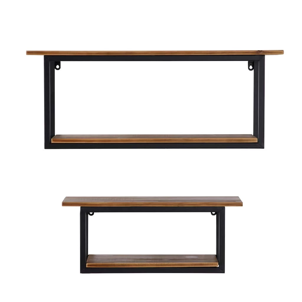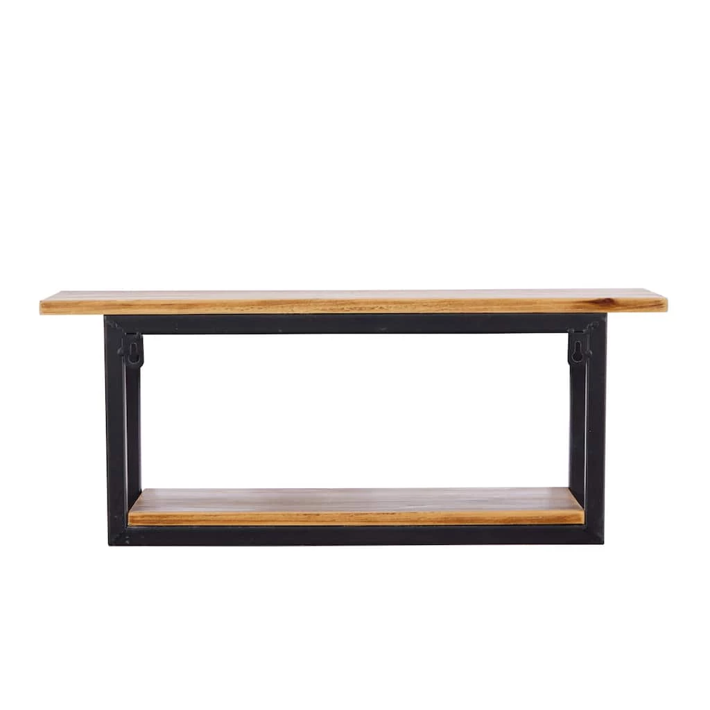These Chinese fir wood two-level floating shelves fill the empty places on your industrial-themed wall. Just attach the iron frames using screws. They can carry books, artworks, collectibles, toys, trophies, potted indoor plants, and other surface decors. They can also work as floating desks designed to save space in the lower part of the wall.