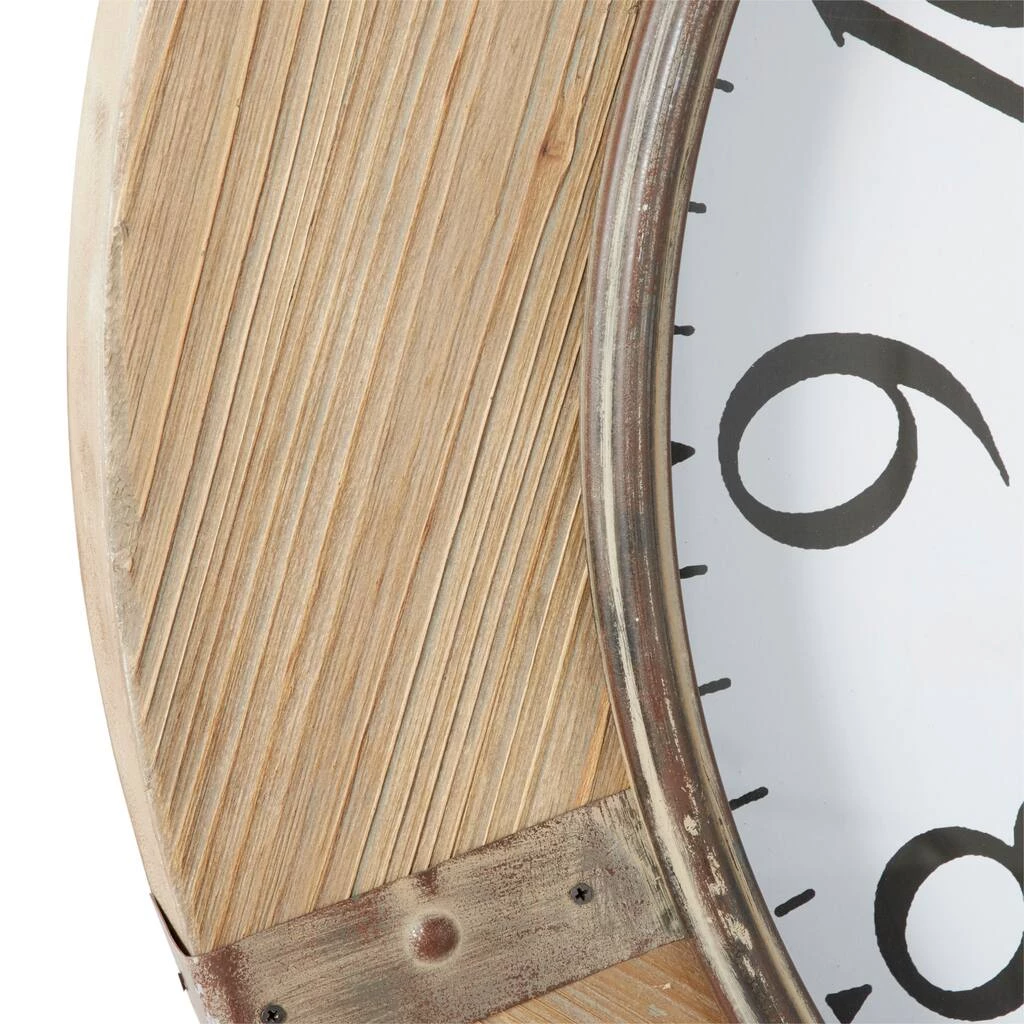 This centerpiece wall clock features beautiful light beige and brown natural wood rich with wood grain texture and large, easy to read numbers. Subtle yet stylish embellishments, such as the silver metal hardware around the wood and the “Cafe du Parc” script, add elevated style without being too showy. The extra large size and numerals make it easy to read from afar. This large wood wall clock reliably runs on one AA battery an is ready to hang. This clock uses Arabic numeral with minute marking. The clock mechanism runs silent. This item hangs via D-ring hardware. Suitable for indoor use only. Typography includes “CafΓ© Du Parc,” “Paris,” and “1927”. Rustic theme. This item comes shipped in one carton.