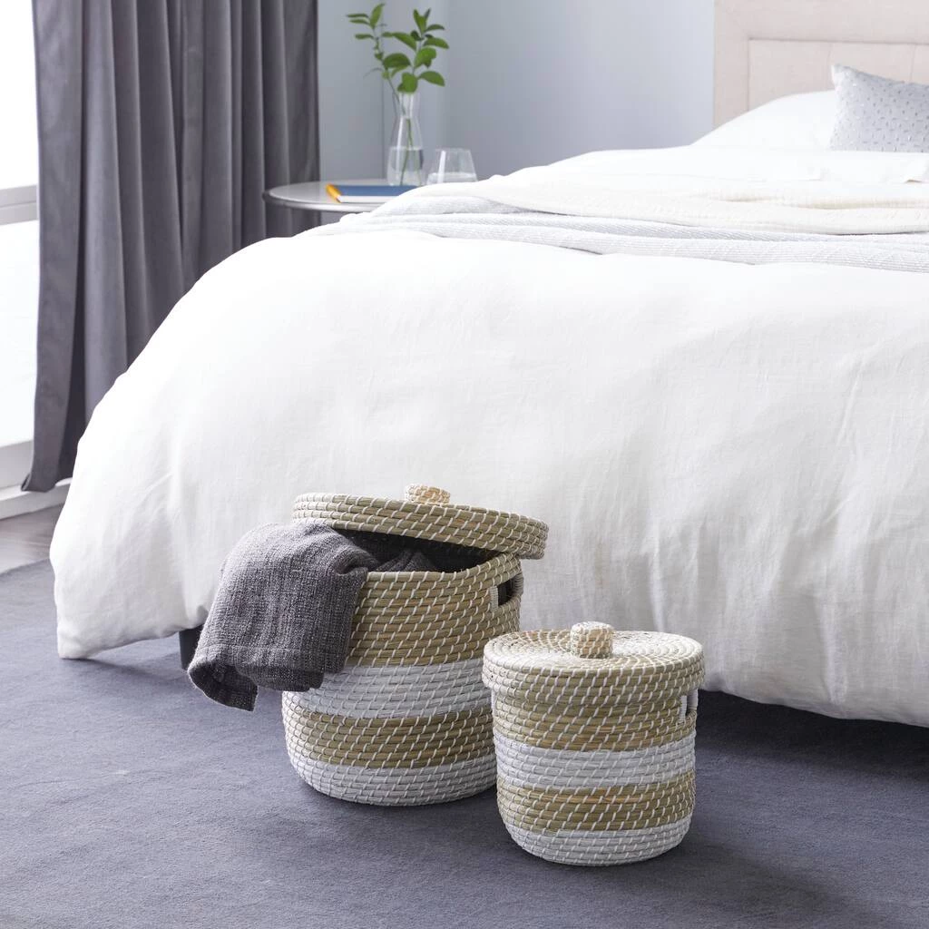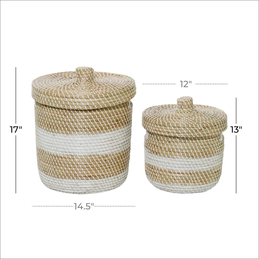 The soft beige and white color palette of these striped seagrass baskets brings light coastal style to your space. Each round basket also features a seagrass lid with a top handle and openings on the sides for hands, so you can use this stylish dΓ©cor as sealed storage baskets as well. The natural Vietnamese seagrass is sun-dried then handcrafted into ropes that are stacked and bound with white plastic bands that also create a checkered pattern. Two center stripes on each basket are painted in matte white for neutral yet lively pattern. These seagrass baskets come as a set of 2βone large and one small.