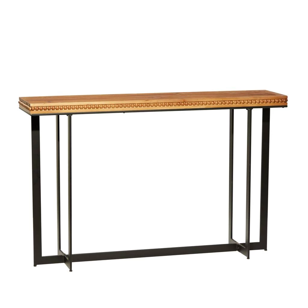 Your traditional inspired living space will not be complete without this gorgeous traditional style brown wood and metal beaded console table highlighting focal points on your walls. This wood and metal console is the perfect supplementary decor in any attempt to decorate a blank wall in your home. Its beautiful brown finish wood surface comes perfectly with its low-profile black finish legs. The tabletop is also lined with wooden beads adding a more traditional vibe. Place this table near your blank walls and any focal point you mount will be instantly highlighted. This item comes shipped in 1 carton. Suitable for indoor use only. Maximum weight limit is 100 lbs. Designed with an industrial theme.