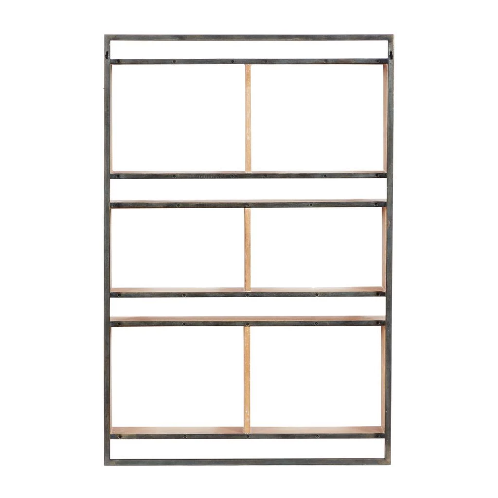 Showcase your minimalist organization skills with this contemporary style brown wood and black metal wall shelf. This unique wall shelf features three brown wooden rectangular shelves divided into two equal partitions by a vertical wood slat which makes the total number of shelves into 6. The shelves are securely attached to large black metal rectangular frame to support the entire structure and for your peace of mind when displaying. This piece will complement the clean and minimalist aesthetic of your contemporary or modern home. This item comes shipped in one carton. Easily hanging using hanging hardware on the back. Suitable for indoor use only. Holds up to 20 lbs. This wall shelf features 6 wooden grids and an inner height of 35.4″, inner length of 23.6″, inner width of 5.7″. Designed with an industrial theme.