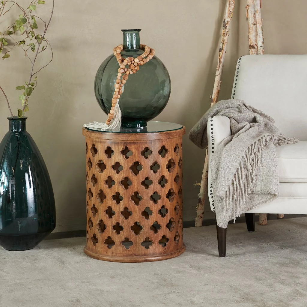 A compact brown round accent table that can easily place beside your sofa or bed and add the right dose of style to your interior. A compact friendly table providing you with additional surface storage space any where in your home. Useful and elegant, side tables are more than just a place to throw your mail or place a lamp. This item comes shipped in one carton. Suitable for indoor use only. Made in India. Rustic Inspired. Holds up to 100 pounds.