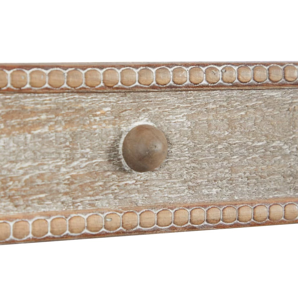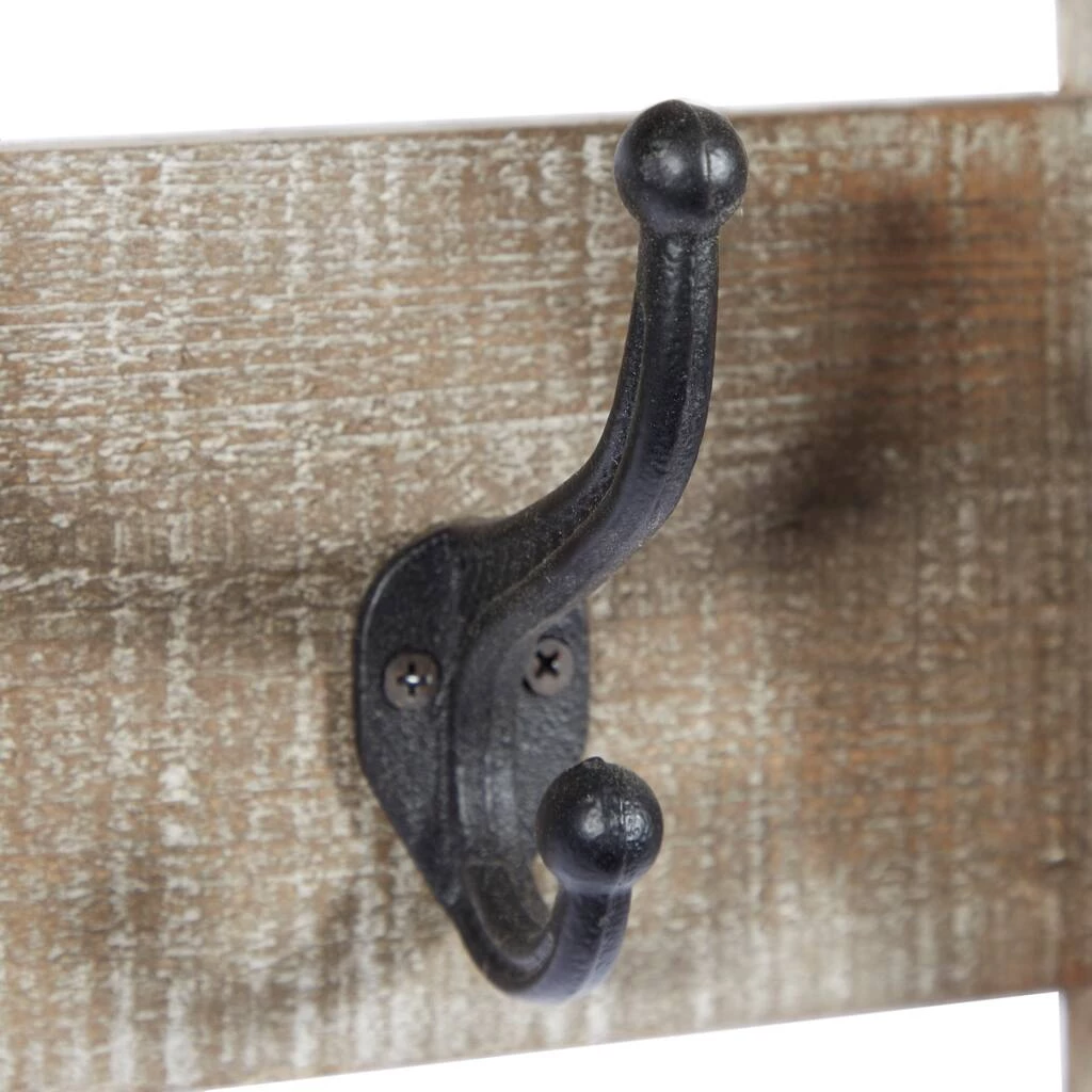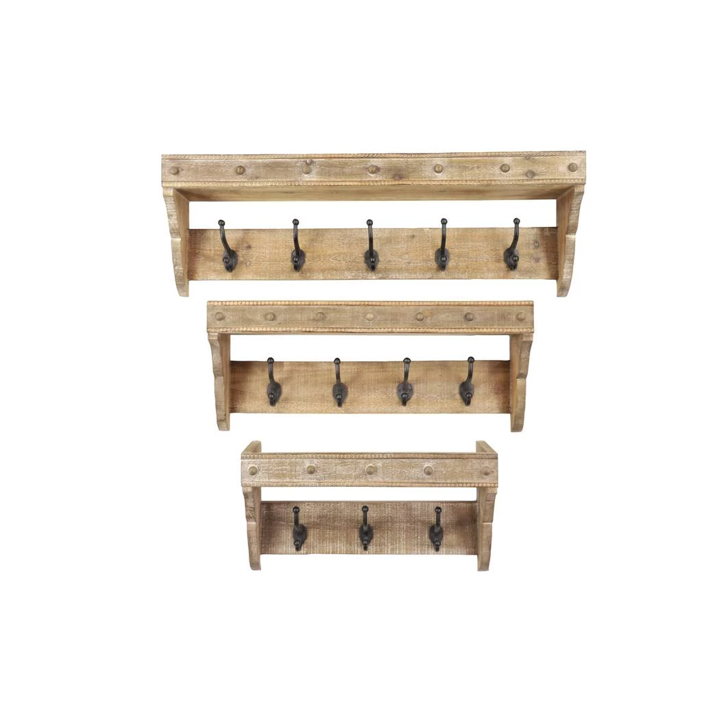 Bring a natural touch and a rustic feel to your entryway or living room with this set of 3 large wood wall racks with wall hooks. Each floating wall rack features scalloped sides, decorative wood studs along the top panels, and 3, 4, or 5 sturdy metal wall hooks, accordingly. Hang lightweight coats, hats, or keys, or display dried flowers or wall dΓ©cor from these solid wood hook racks. This wall dΓ©cor set complements farmhouse-, natural-, and rustic-style spaces and adds an earthy element wherever they’re placed. They’re easy and ready to hang via the D-ring hardware behind each rack. Each hook holds 5 to 8 lb.