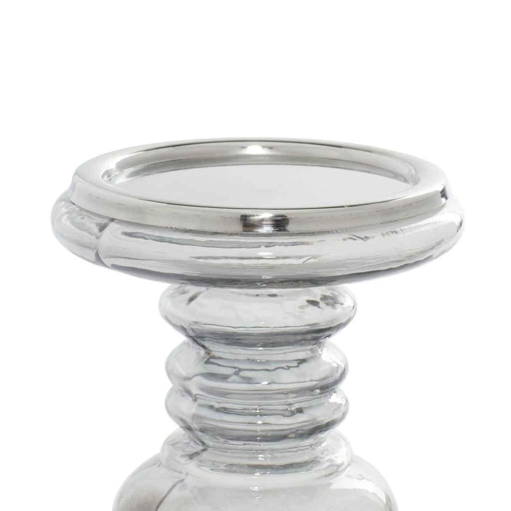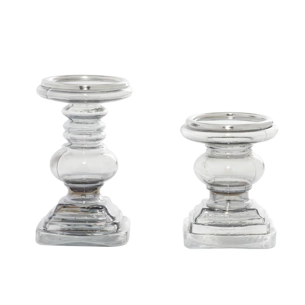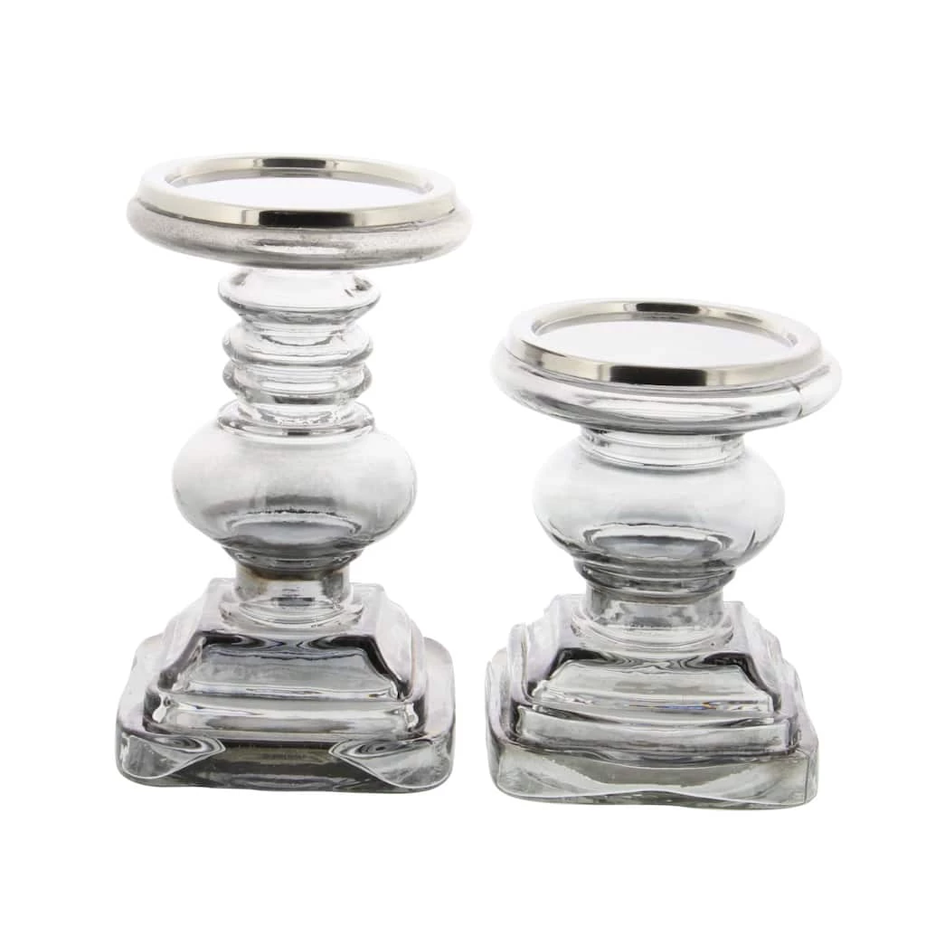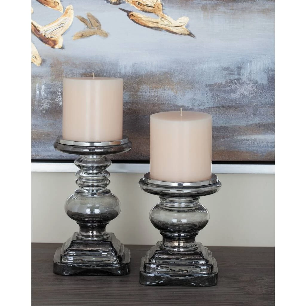 The versatile smoky gray glass finish of these stout yet stately traditional candle holders will complement any color palette or patterns in your home beautifully. Perfect for large pillar candles, these candle holders bring ambient, flickering light to your tabletops with stylish smoked glass, adding depth and dimension to the serpentine turned column shapes. Iron candle plates secure your candles in place. These candle holders come designed with black rubber stoppers at the base that prevent scratches on furniture and tabletops, and keep them from sliding around. Each pillar candle holder can accommodate 1 votive and pillar candle. Due to the handmade nature of this item, no two will be alike; there will be slight differences in shape, size, and color.
