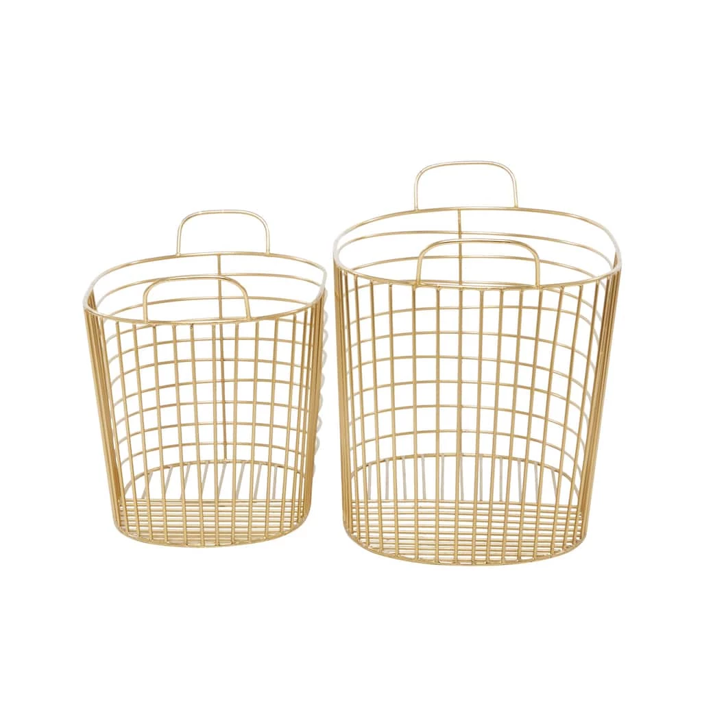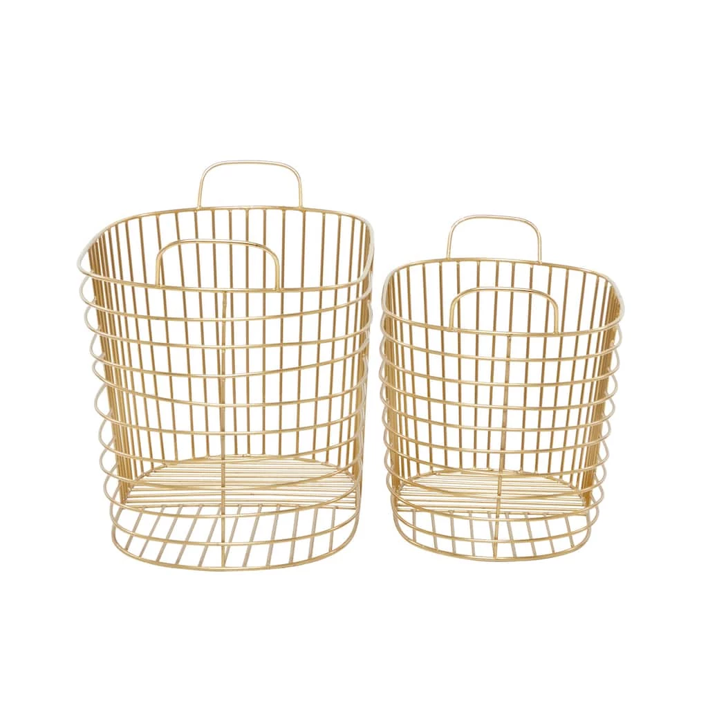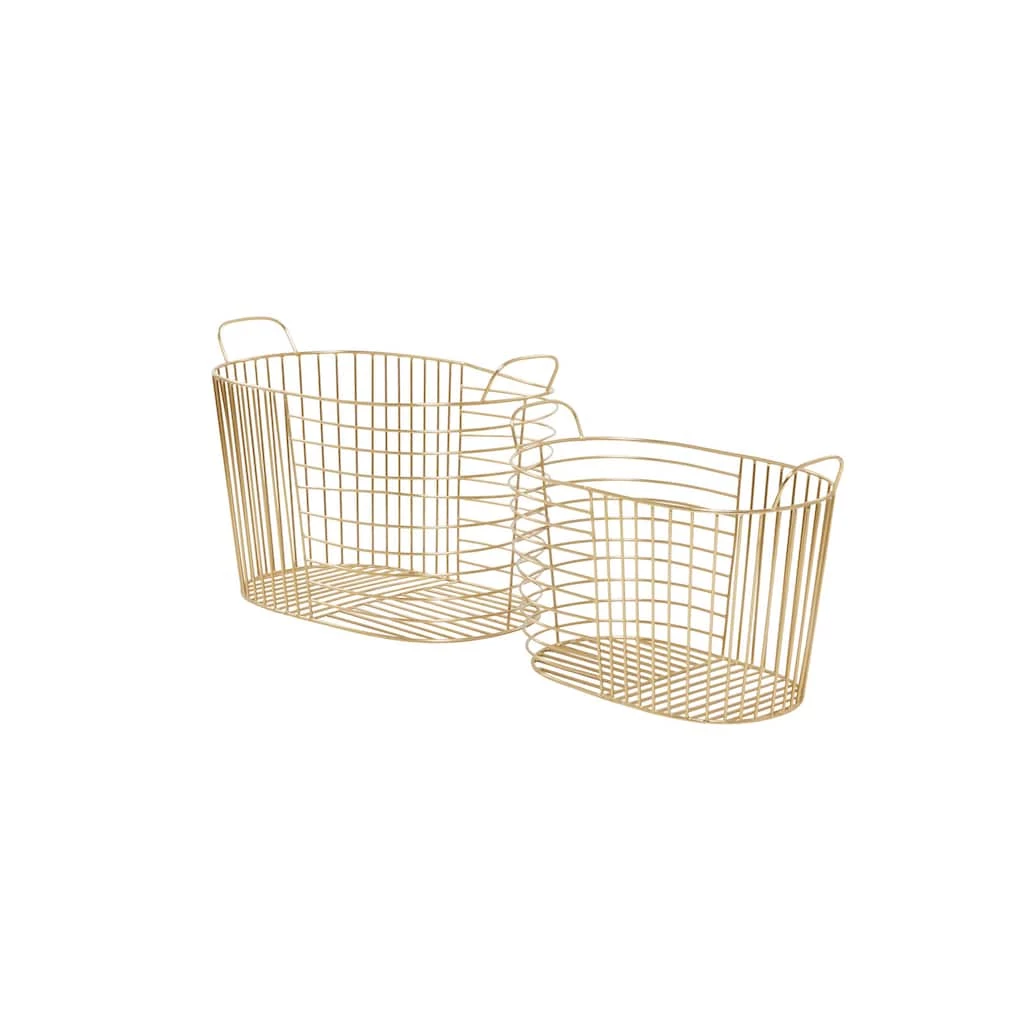 A contemporary style offers neutral elements and basic forms with a bold design. A set of oblong storage baskets crafted of sturdy and polished metal material. This set of 2 storage baskets comes in a polished gold finish that gives glamour and character to your home. These gold storage baskets feature oblong grid-style bodies with deep setting and arched handles. Offer any contemporary themed home a final touch by displaying this storage basket set that can hold throws, pillows, or magazine.