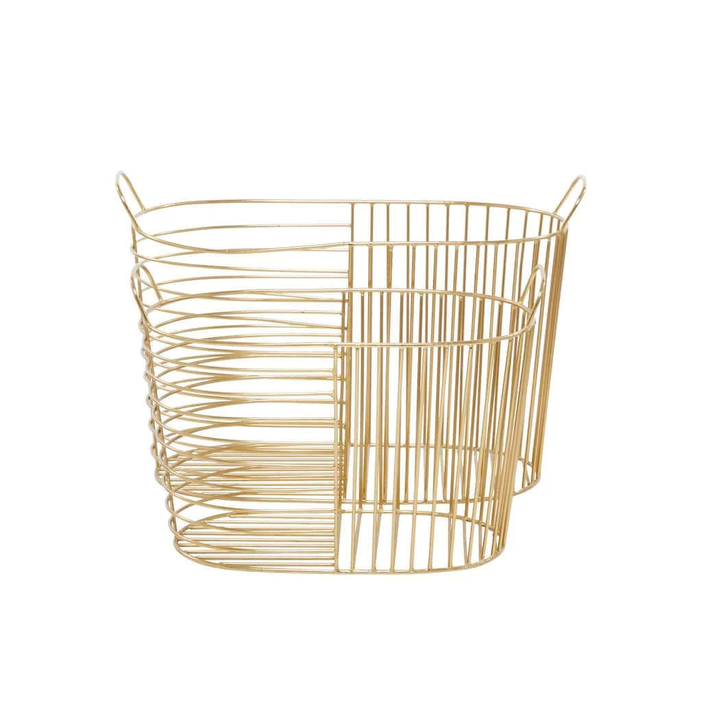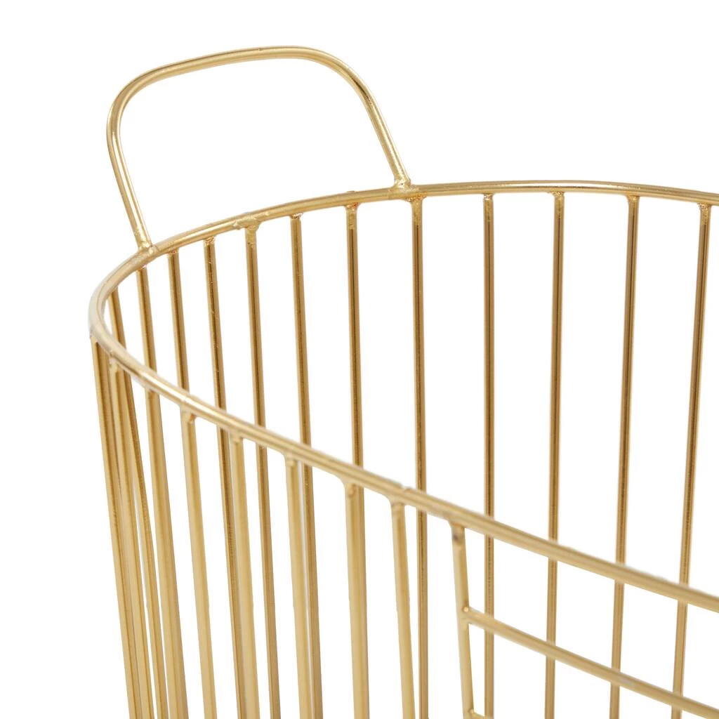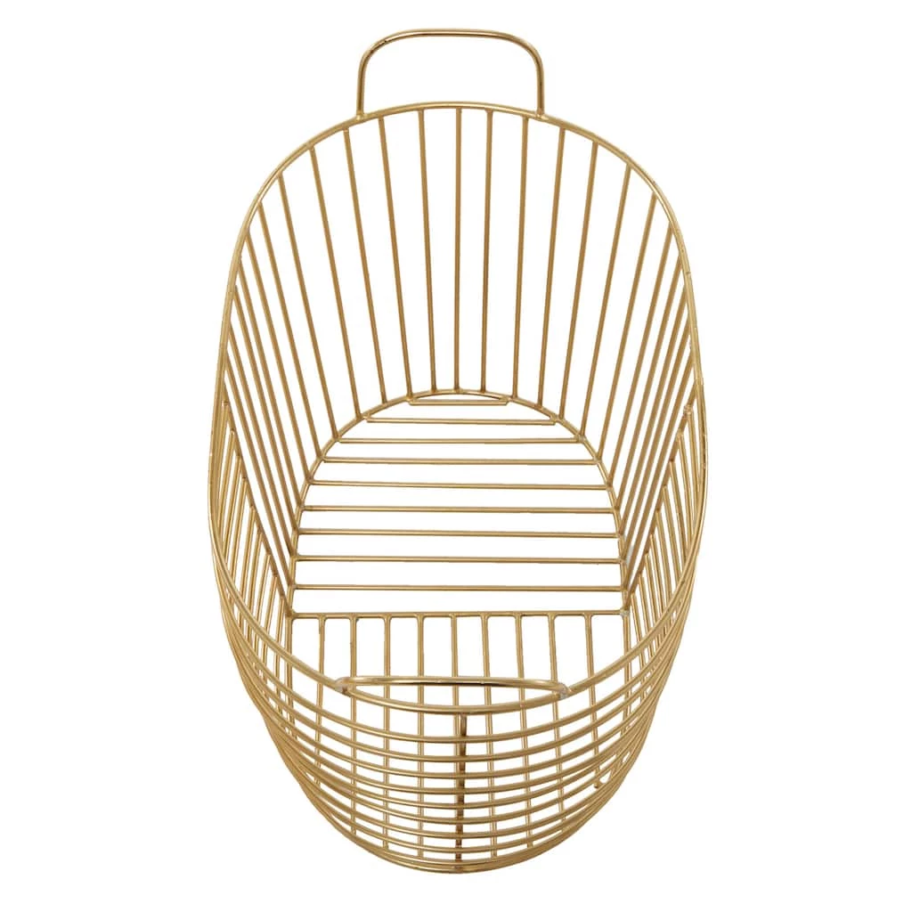 A contemporary style offers neutral elements and basic forms with a bold design. A set of oblong storage baskets crafted of sturdy and polished metal material. This set of 2 storage baskets comes in a polished gold finish that gives glamour and character to your home. These gold storage baskets feature oblong grid-style bodies with deep setting and arched handles. Offer any contemporary themed home a final touch by displaying this storage basket set that can hold throws, pillows, or magazine.