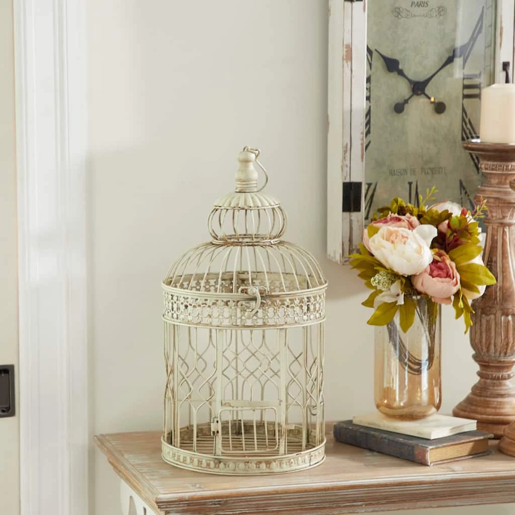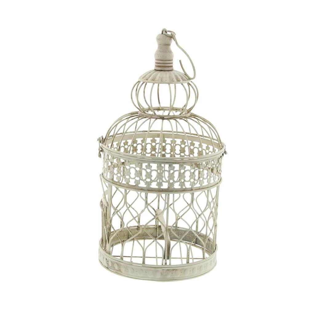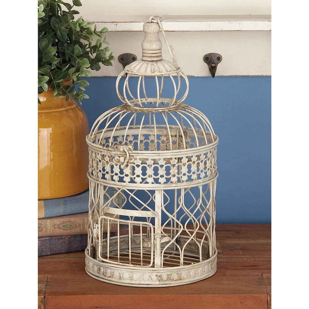 These distressed white bird cages are meant to add a whimsical and vintage look for antique, boho, shabby chic, and French provincial interiors and exteriors. They work as hanging fixtures by the veranda or porch and as table displays on top of dressers or console tables. Fill this 2-piece set with dried flowers, or display potted plants in them with vines flowing from between the iron bars. Both the cage top and small door in the front easily open via secure latches.