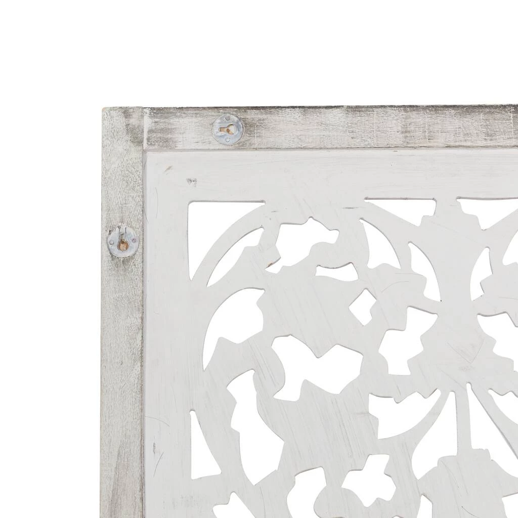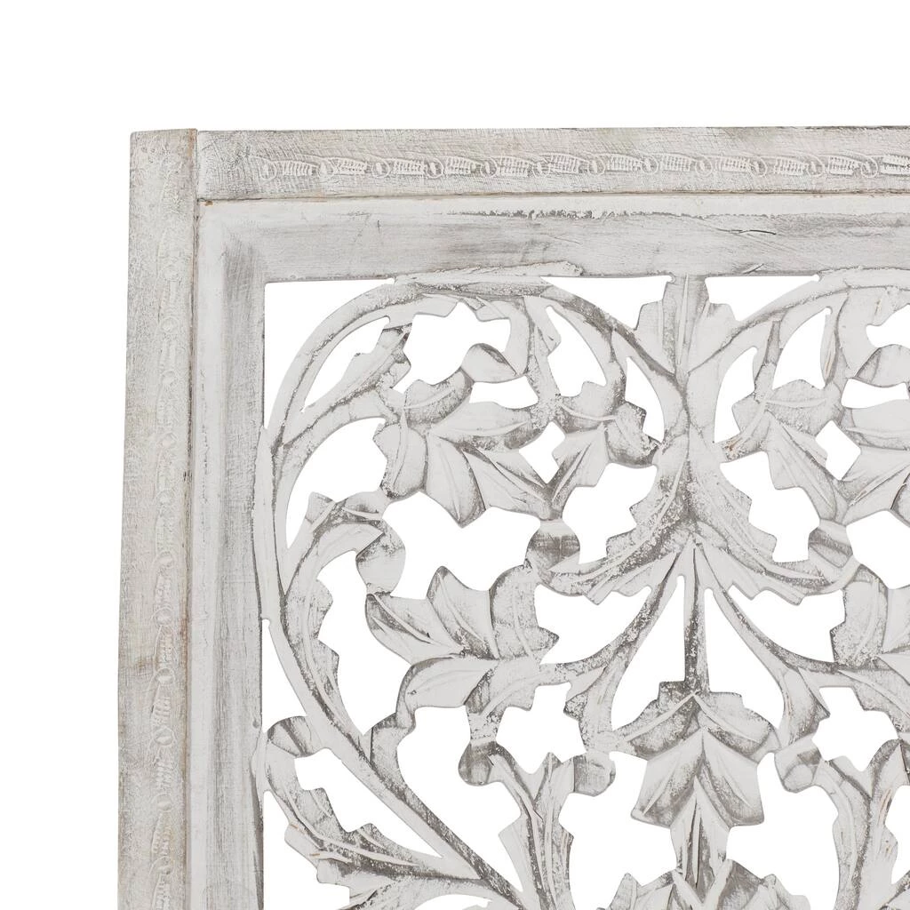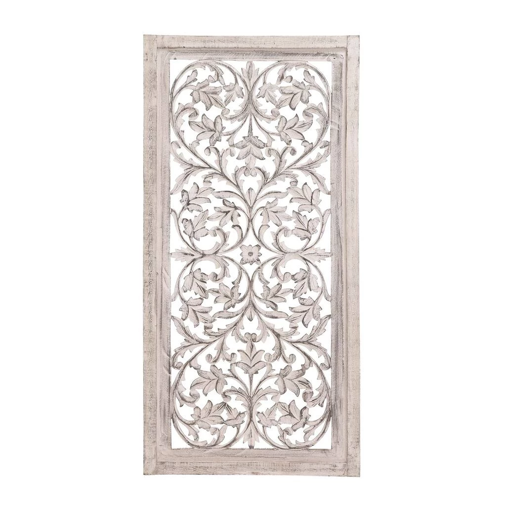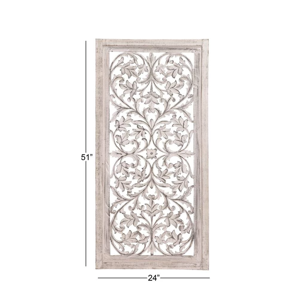 This wood wall decor features carved acanthus, flower, and leaf sculptures throughout the tall, rectangular decorative wood panel. It was hand-crafted in India and given a distressed whitewashed finish that accentuates the wood grain and ornate details while creating a neutral hue that pops against colorful walls and integrates into any color palette seamlessly. However, it is best appreciated with traditional-themed metal and wood furniture pieces. This 51″L x 24″W wooden wall art decor hangs via metal backing hardware. Due to the handmade nature of this item, no two will be alike, there will be slight differences in shape, size, and color. Suitable for indoor use only. This item comes shipped in one carton.