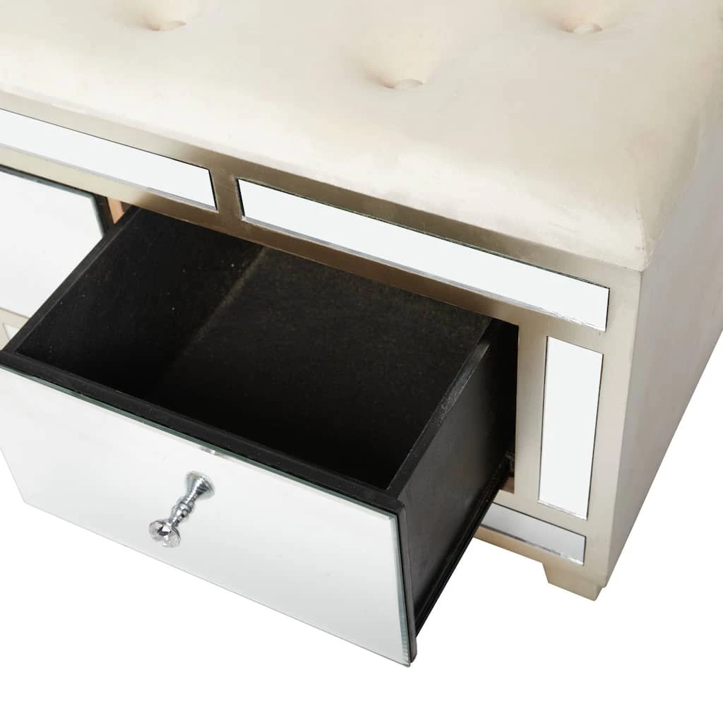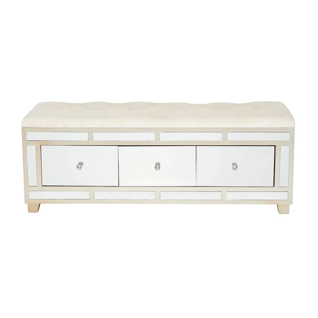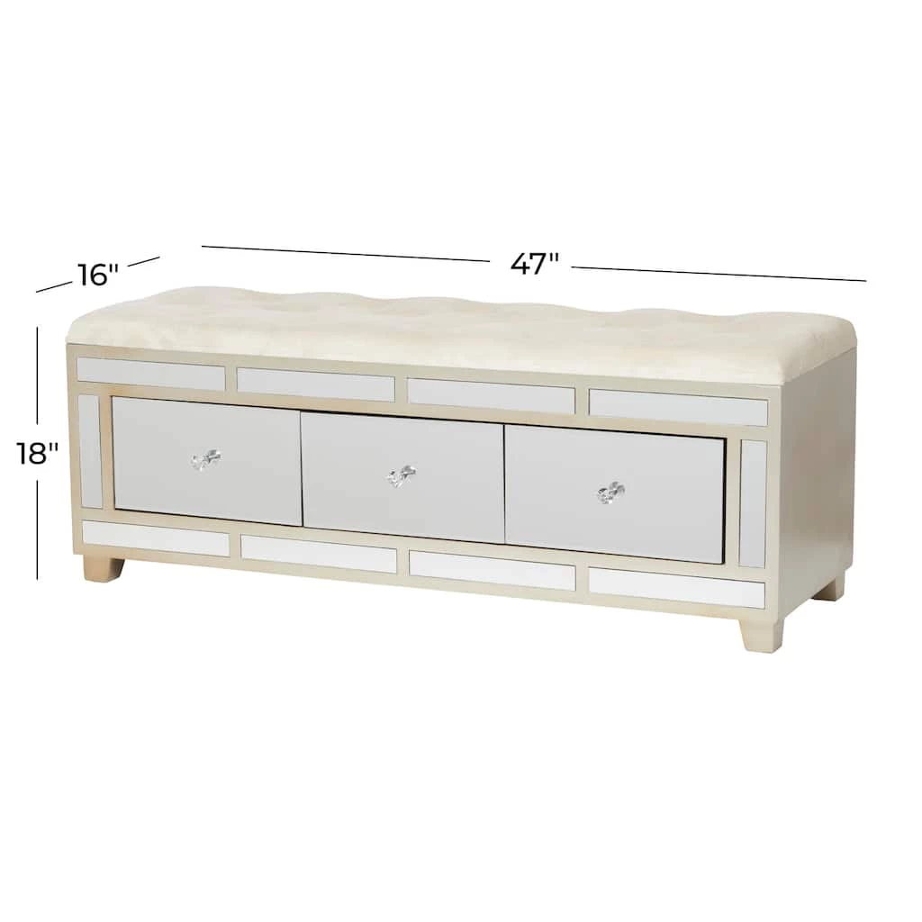 So take a load off and relax on this decorative bench. A small piece of furniture that make a big difference to give your home an instance refresh. Elevate the style of your glamorous home offices with the addition of this end bench with drawers and pair it up with soft and fluffy, neutral toned cushions. This item ships in 1 carton. This wooden bench features a soft velvet cushioned seat. This large bench showcases 3 mirror drawers designed with round acrylic knobs. Suitable for indoor use only. This storage bench features a 250 lbs max weight limit. This storage bench features a 2-person seating capacity. Glam style.