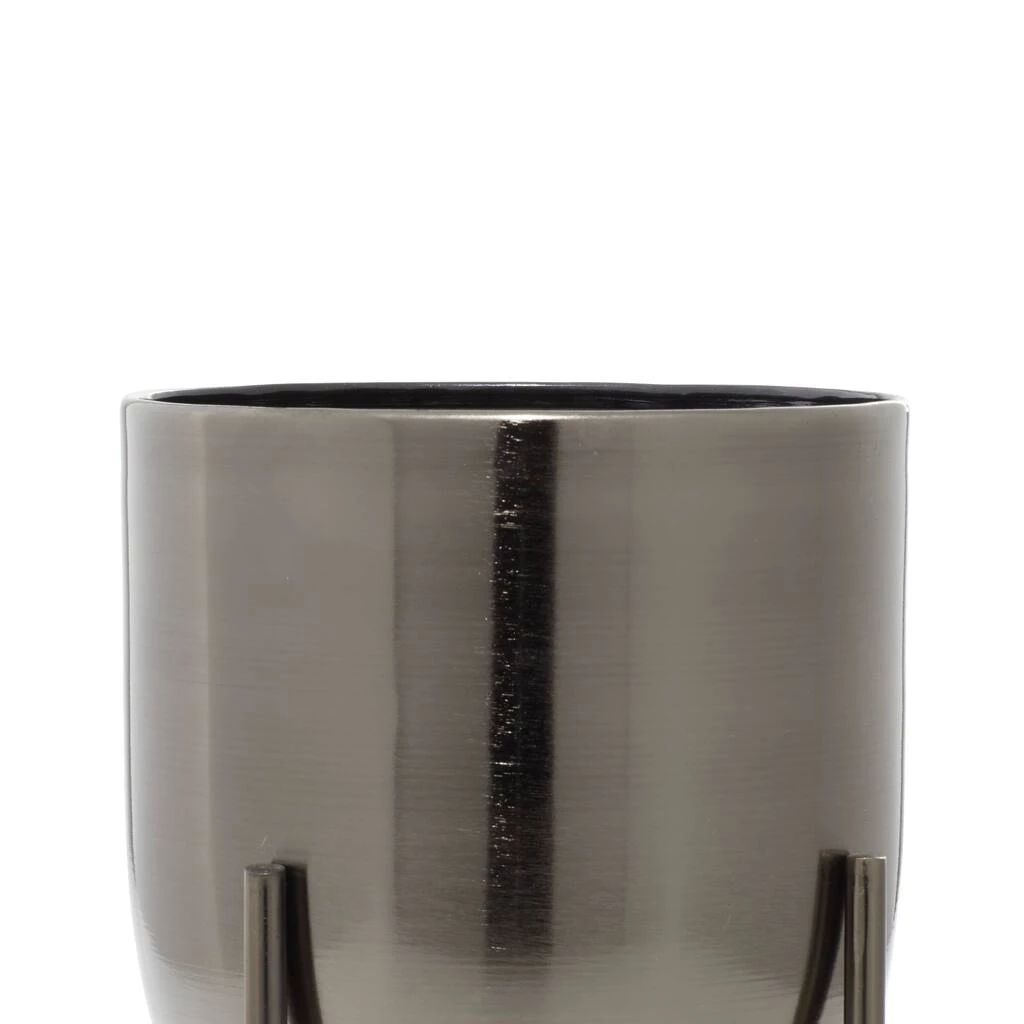 Add metallic shine and contemporary style to your space with this pair of metallic dark silver planters in silver metal stands. Solid iron construction means lightweight, durable, and safe from the elements when placed outside. Deep, round planter bodies will beautifully display an array of plants and the extra height from the elevated bases let your vines flow freely. Neutral yet stunning metallic pewter silver finishes complement any pattern or color palette with a chic touch. Display on any floor surface from your garden to office to add a splash of sterling shine to complement your contemporary space. Feature rubber stoppers beneath each base to prevent scuffing and sliding.