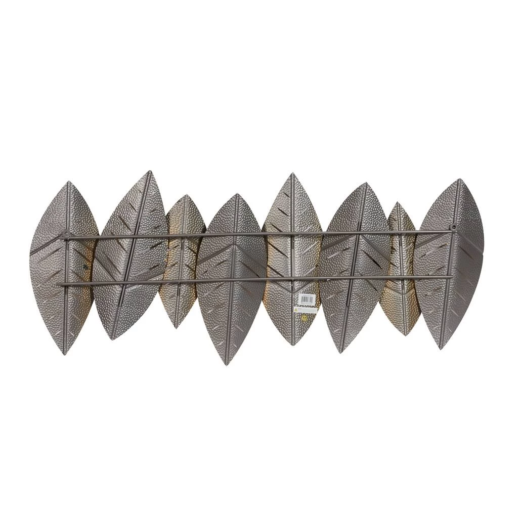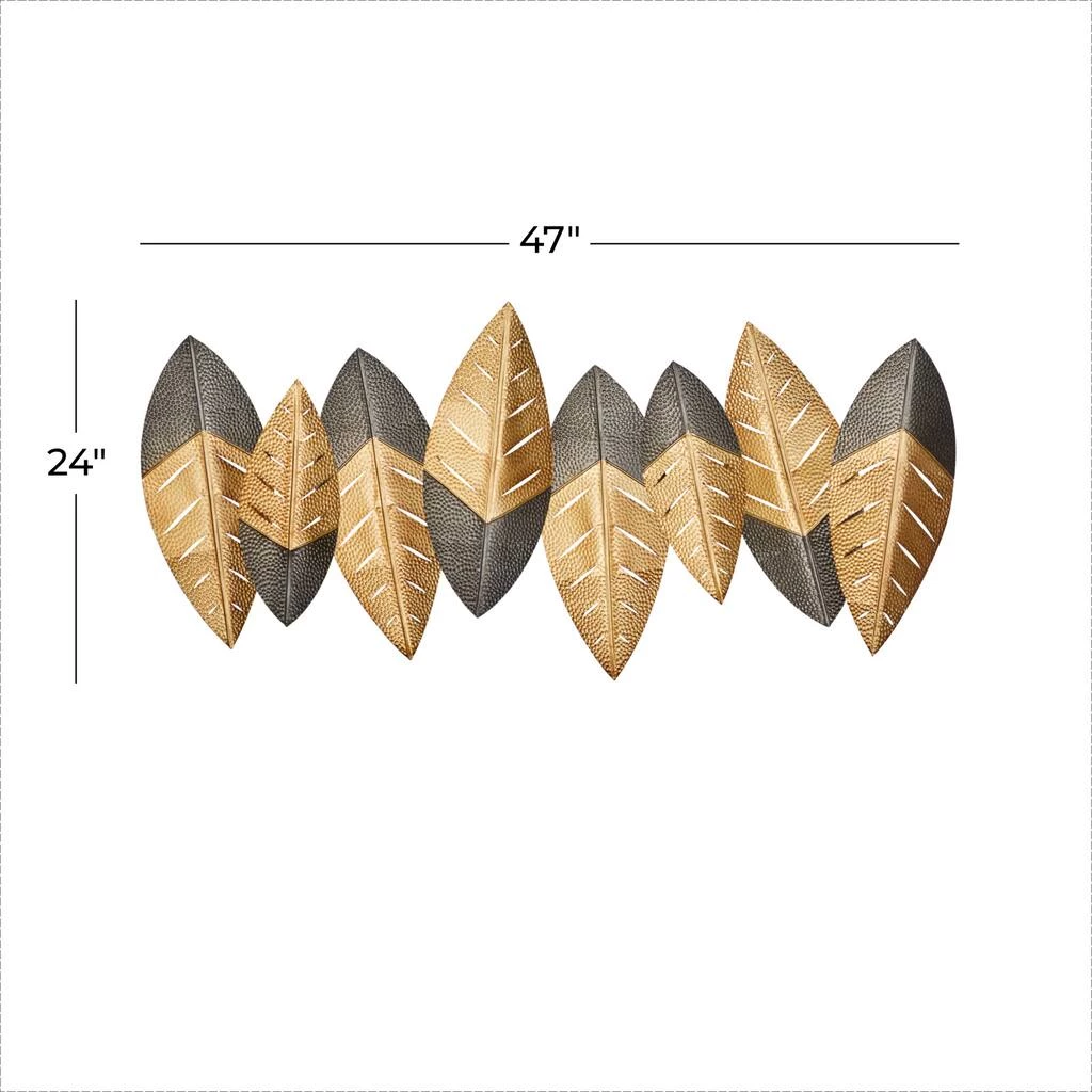 Transform your home or office into a stylish space with this hammered metal leaf art. Each leaf is sleek and has a textured metal surface. The black and gold palette is exquisite and can fit well with a variety of decorating styles. The metal leaves are arranged in a row, so the dΓ©cor looks stunning when positioned above a table or mantel. The included mounting hardware ensures it’s easy to hang this wall art in any room.Β