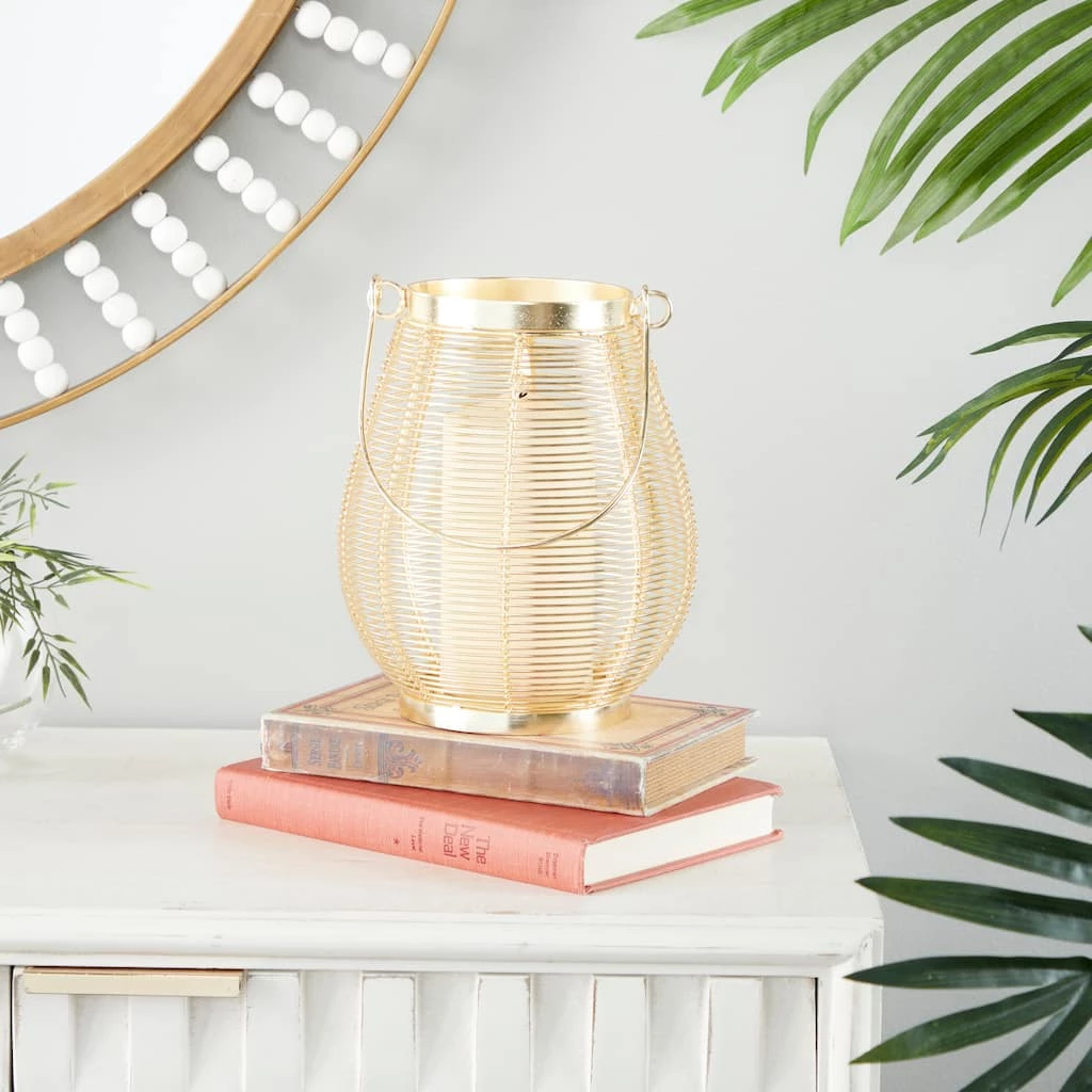 Adorn any of your home spaces with this lantern table decor for a dash of gold and shimmer Delight your guests and make any occasion extra special by adding a lighted or flameless candle to this lantern. A sturdy and long lasting construction that for a long lasting display. This lantern candle holder can hold 1 pillar or votive candle. This item comes shipped in one carton. Easy to hang and transport with handle. Glam design. Suitable for indoor use only.