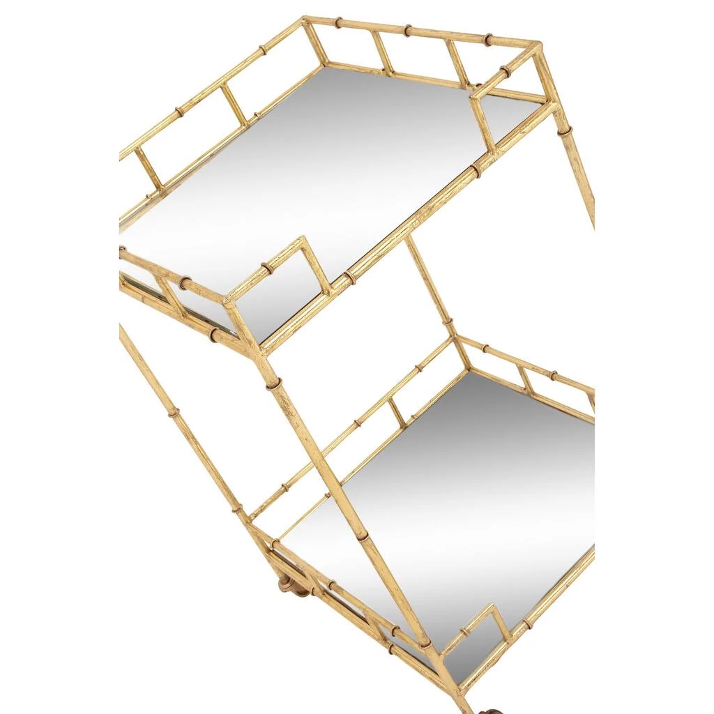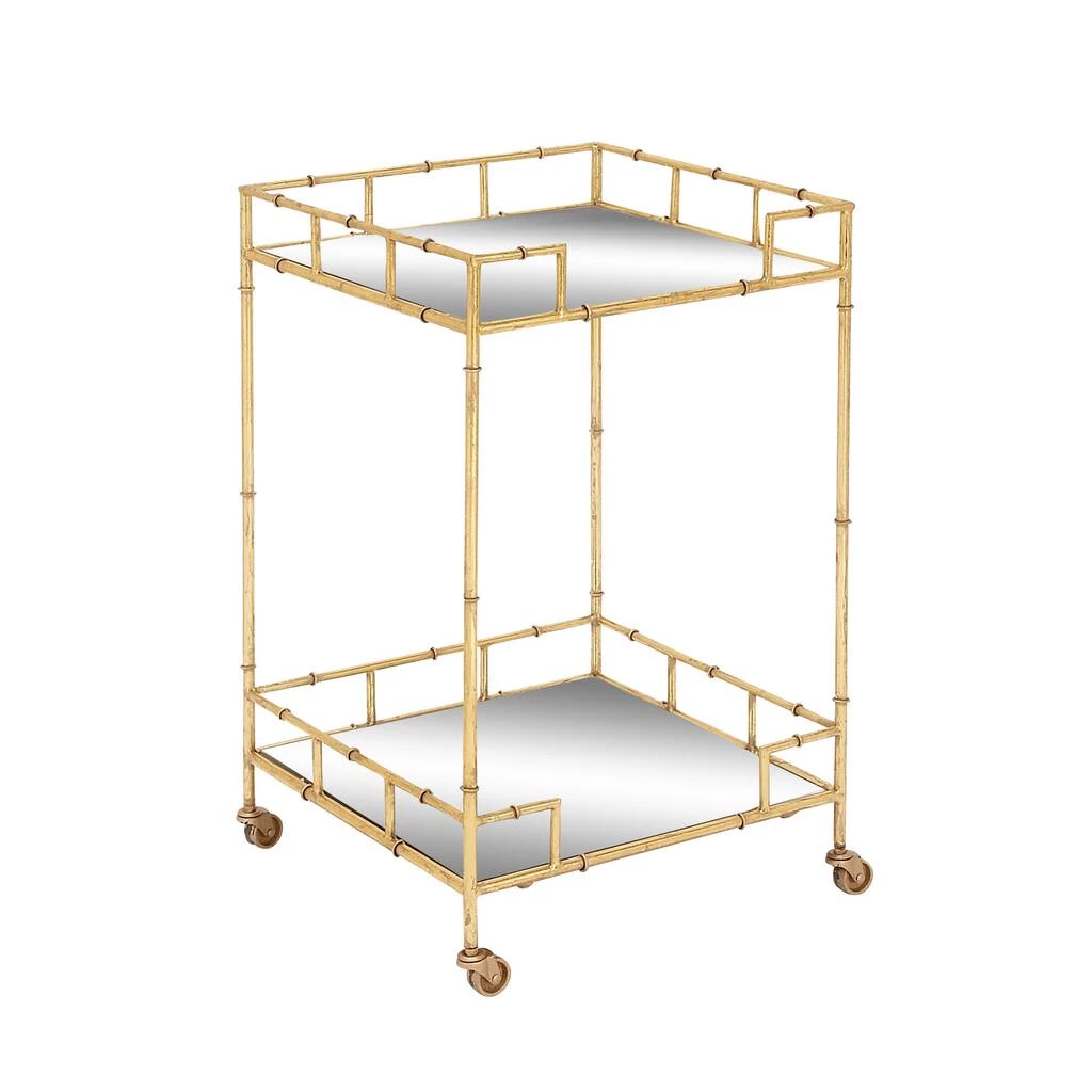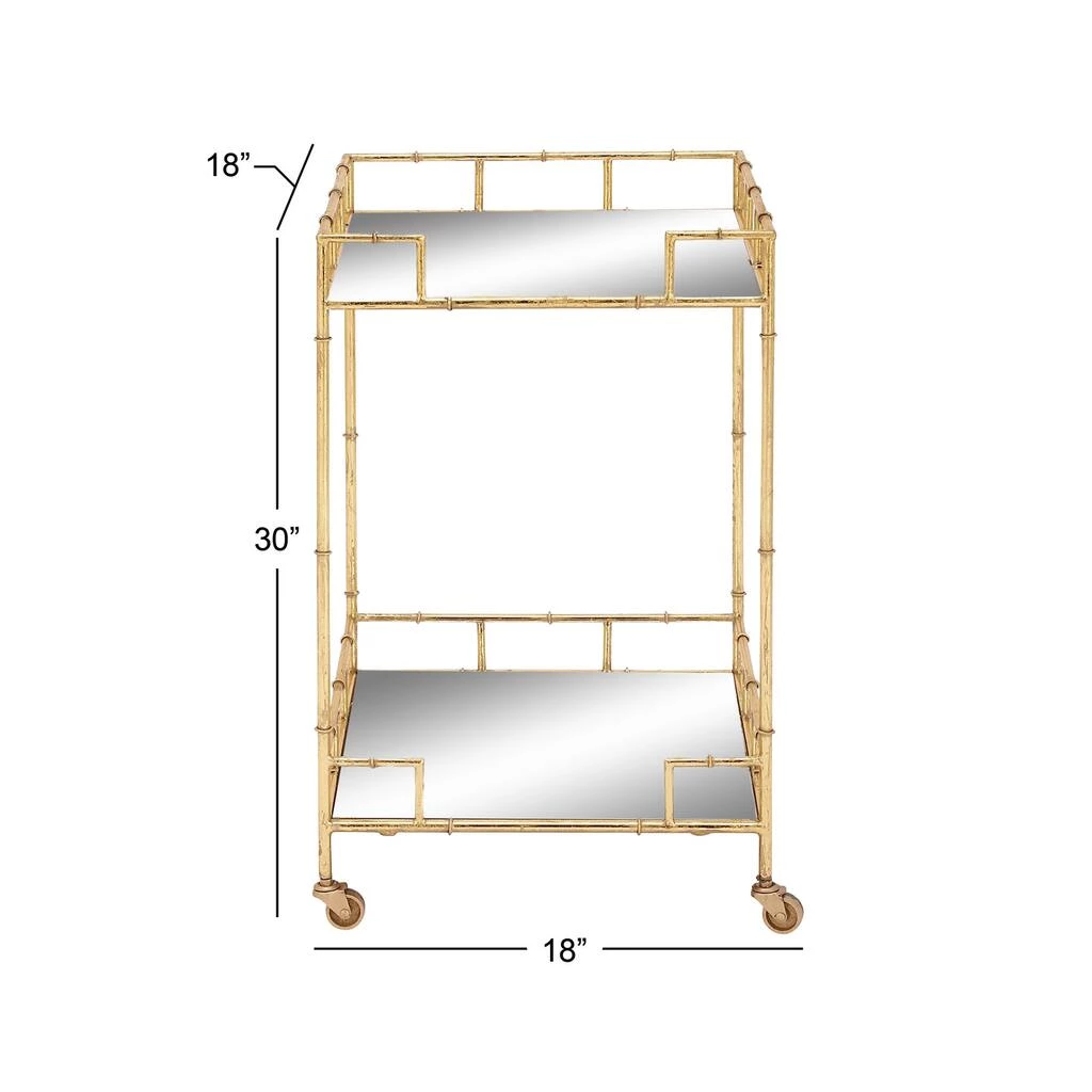 The bar cart’s polished gold finish and gleaming mirrored trays make for a sleek, trendy design that will be right at home in contemporary spaces. Looks stylish in your living room or kitchen as a serving tray or as a decor stand. An optimal mobility piece of furniture that will show to wow your guests for any occasion. This item comes shipped in one carton. Four wheels for easy movement. Suitable for indoor use only. This bar cart features 2 shelves both measuring 16″ deep and 16″ wide. Traditional theme. Maximum weight limit is 100 lbs