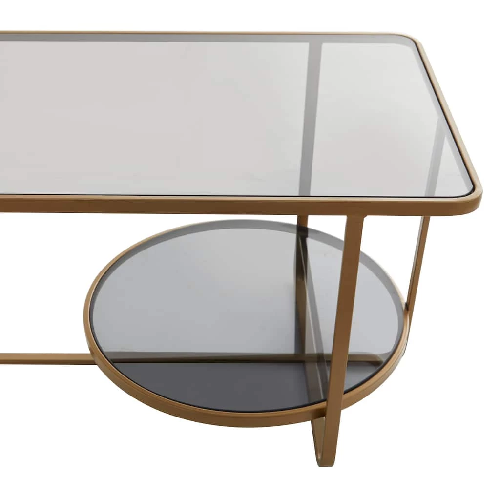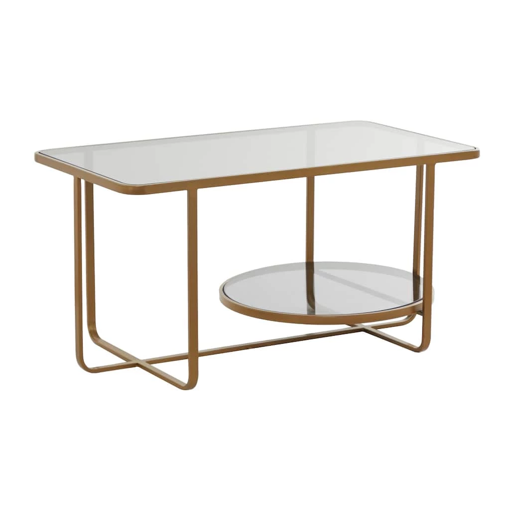 A spacious table top with a unique design offers an eye catching display from every angle. Useful and elegant, coffee tables are more than just a pretty piece of furniture in front of your couch. Introduce a new element into your living room with this gold coffee table that can add storage and the right dose of elegance to your interior. Designed with rubber stoppers at the base that prevent sliding around as well as scratching the floor. This item ships in 1 carton. Suitable for indoor use only. Maximum weight limit is 100 lbs.. This item has 2 shelves. Contemporary Theme.
