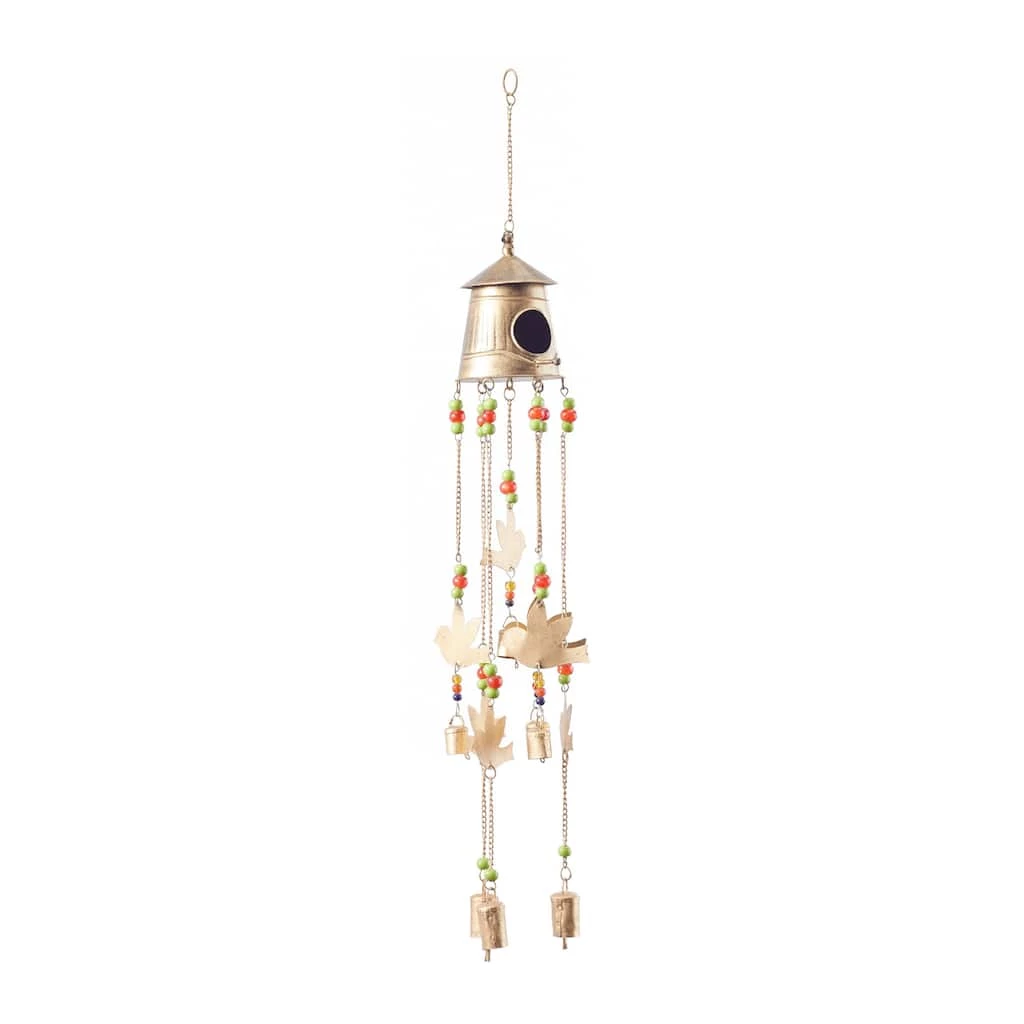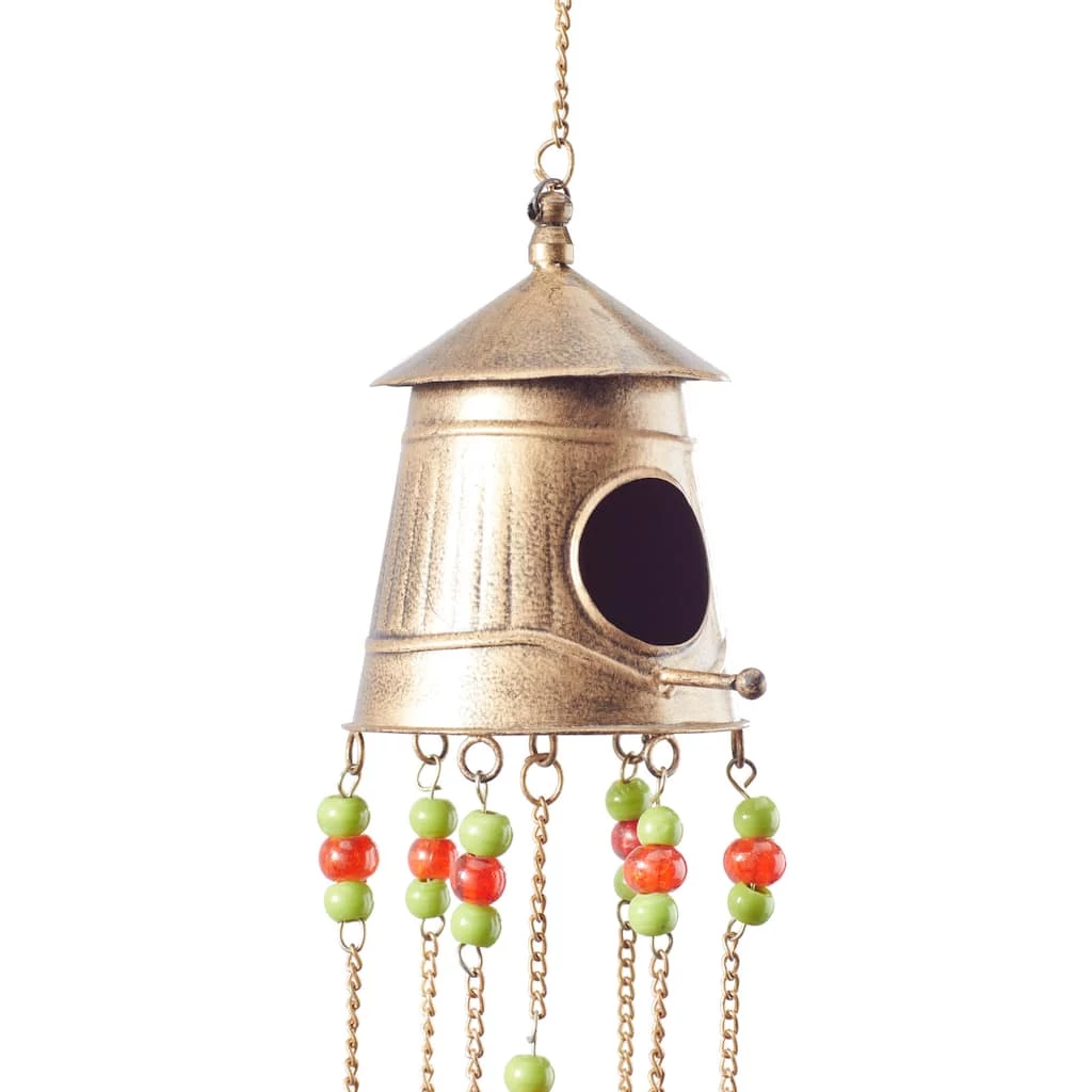 Let the wind give music to your ears as you hang this birdhouse windchime on the top of your doors, windows, and balcony area. A light and delicate piece to create a whimsical atmosphere anywhere in your home. The soothing sound of this windchime will keep you relax and rejuvenated throughout the day. This item is shipped in one carton. Iron is sculpted and chains are decorated to form a charming birdhouse windchime design. This windchime features a durable chain hanger for easy hanging via nail or hook. Suitable for indoor and outdoor use. Made in India. Rustic style.